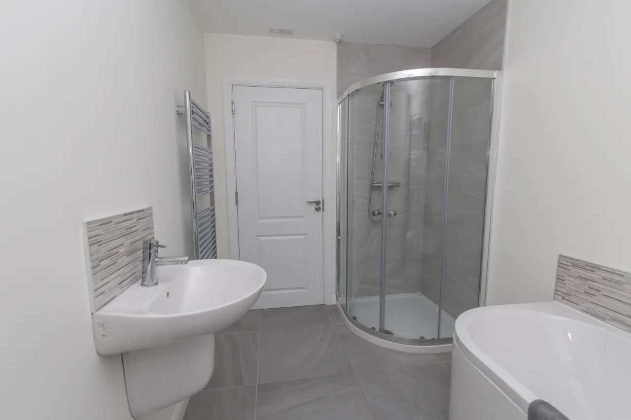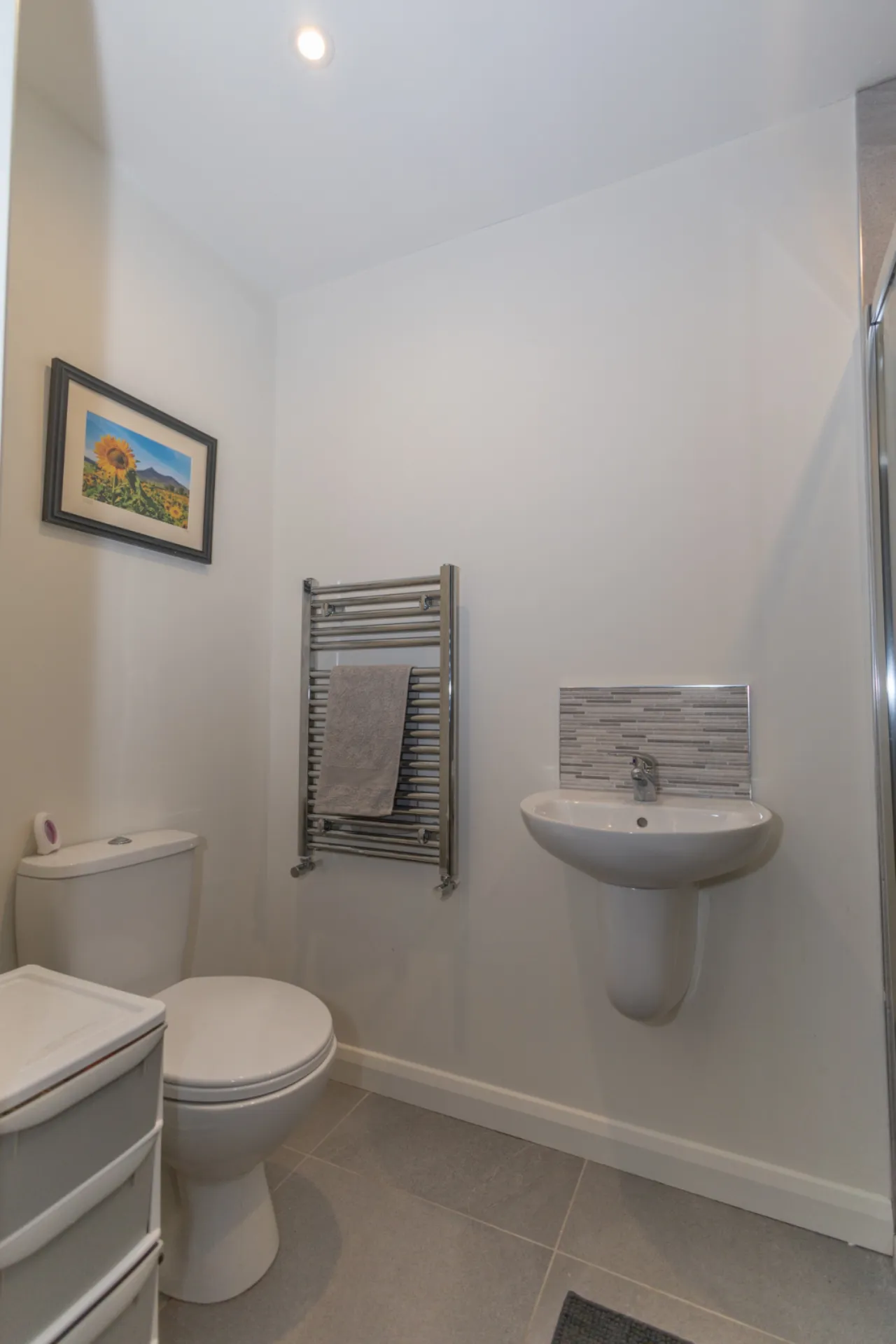 Tiled flooring with white suite comprising WC and wash hand basin with tiled splashback. Corner mains shower unit, tiled behind. Wall-mounted heated towel rail and recessed spotlighting.
