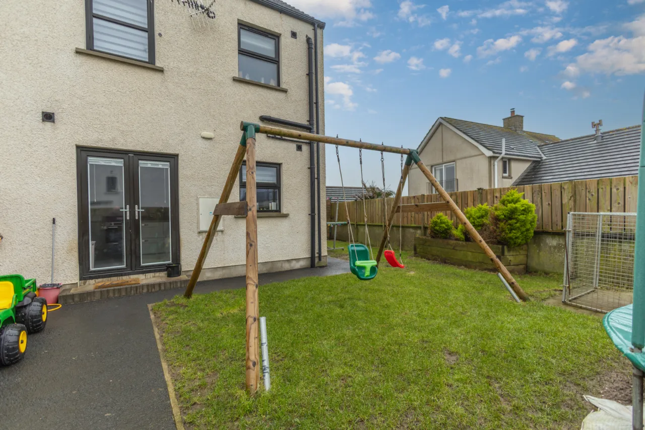 Front and side gardens laid in lawn with paved pathway leading to the front door. To the rear, a tarmac area provides parking for two cars, along with an enclosed lawned garden and paved patio area.