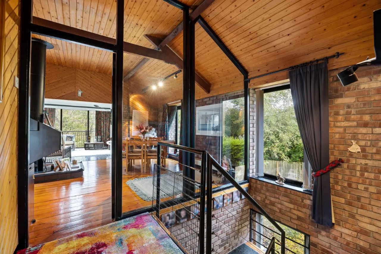 Exposed brick and wood panelled walls, wood panelled ceiling.