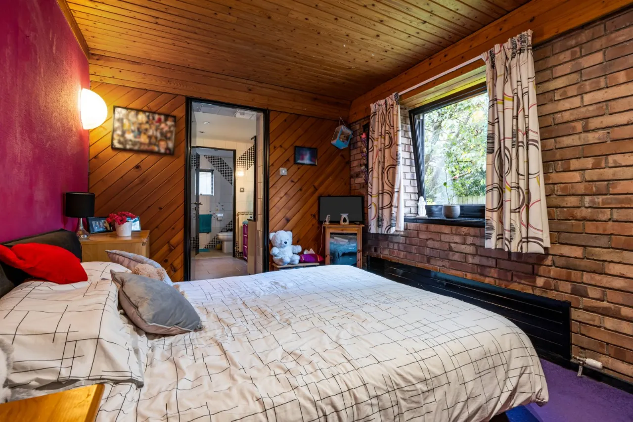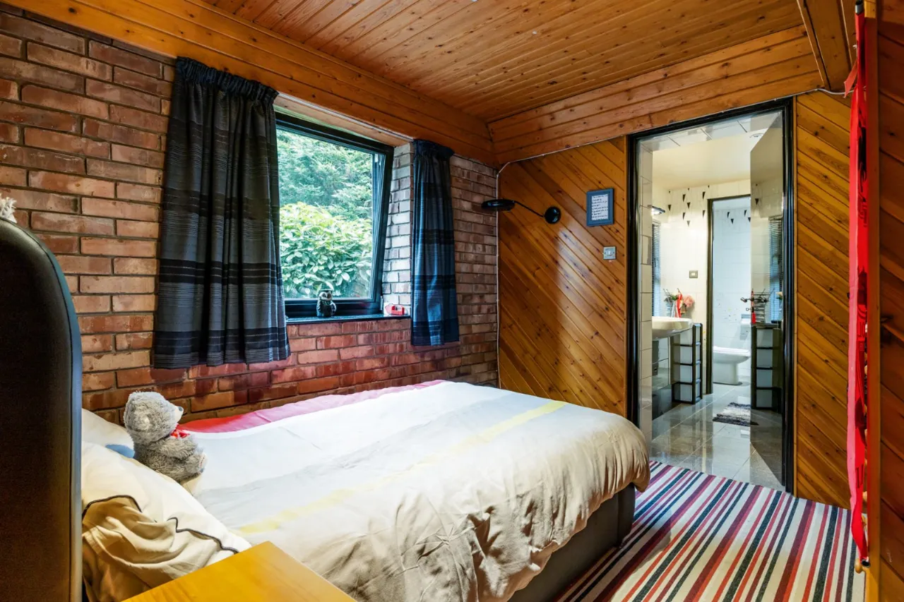Part wood panelled and exposed brick walls, wood panelled ceiling.