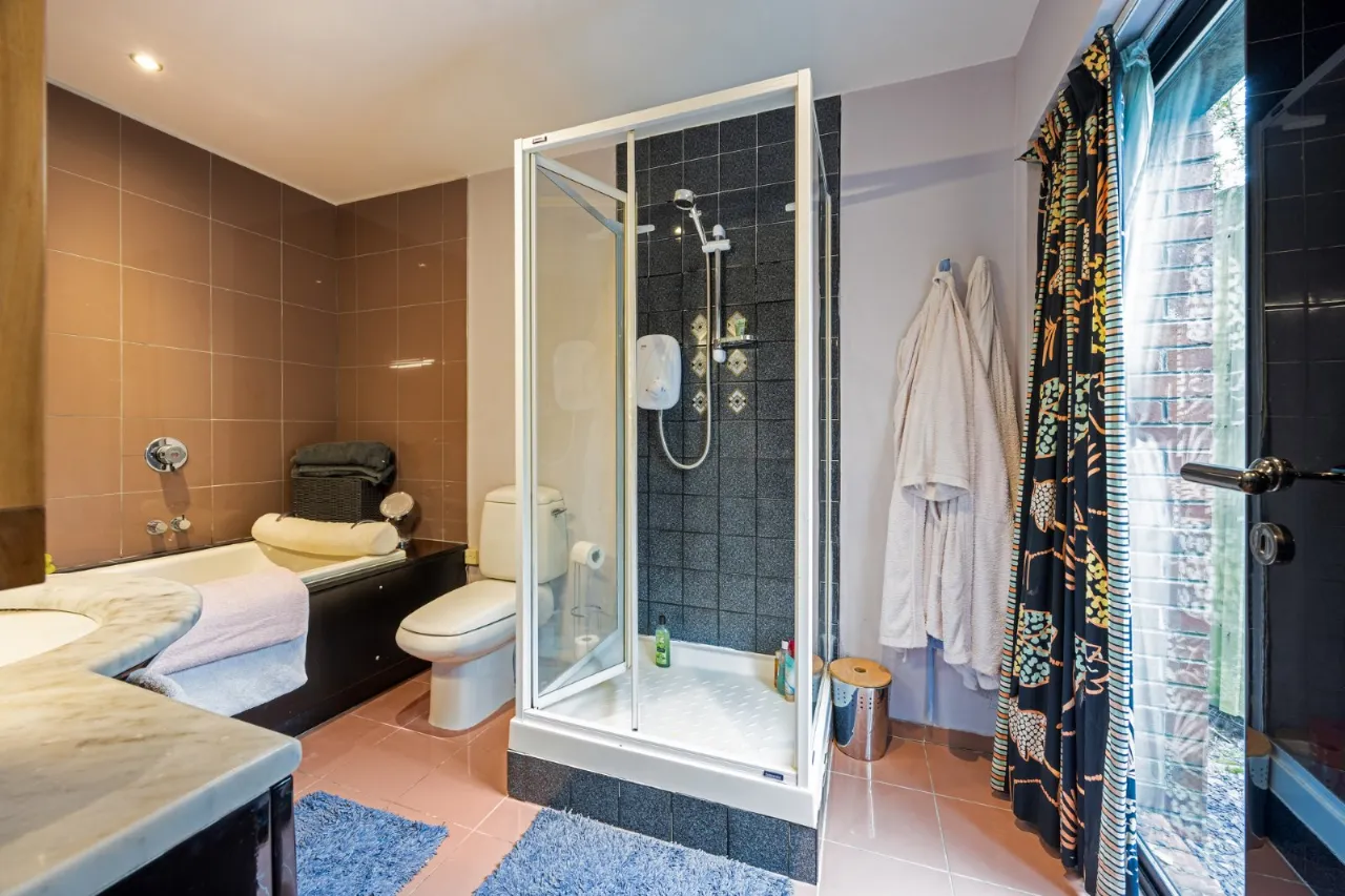 Built-in shower with Triton shower, low flush w/c, fully tiled walls, tiled floor, recessed spotlights.
