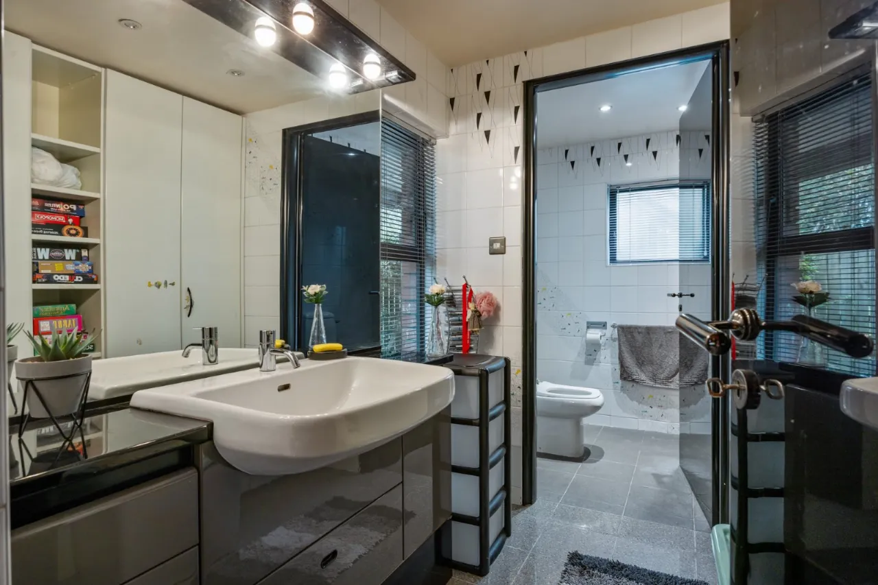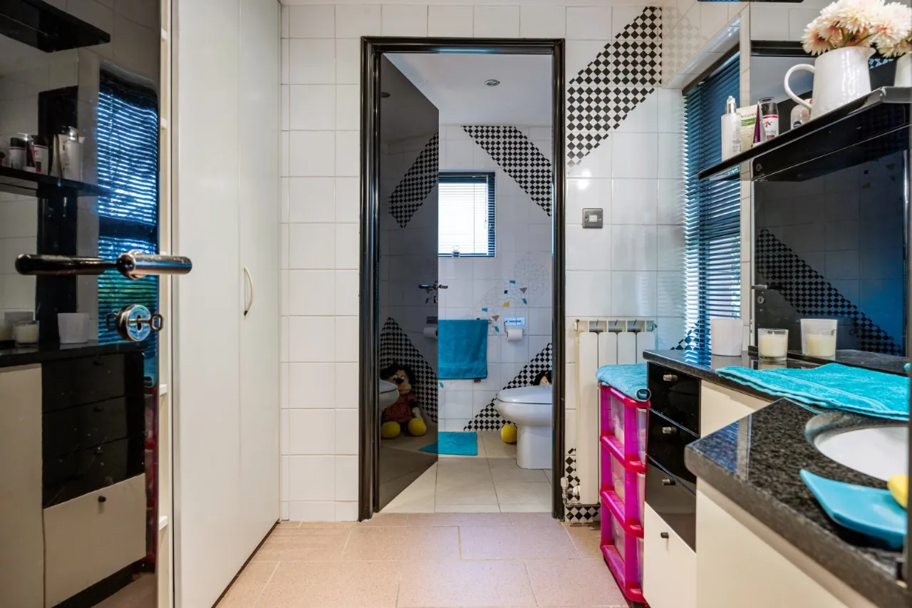 Built in storage, wash hand basin with granite surfaces and storage below, fully tiled walls, tiled floor.