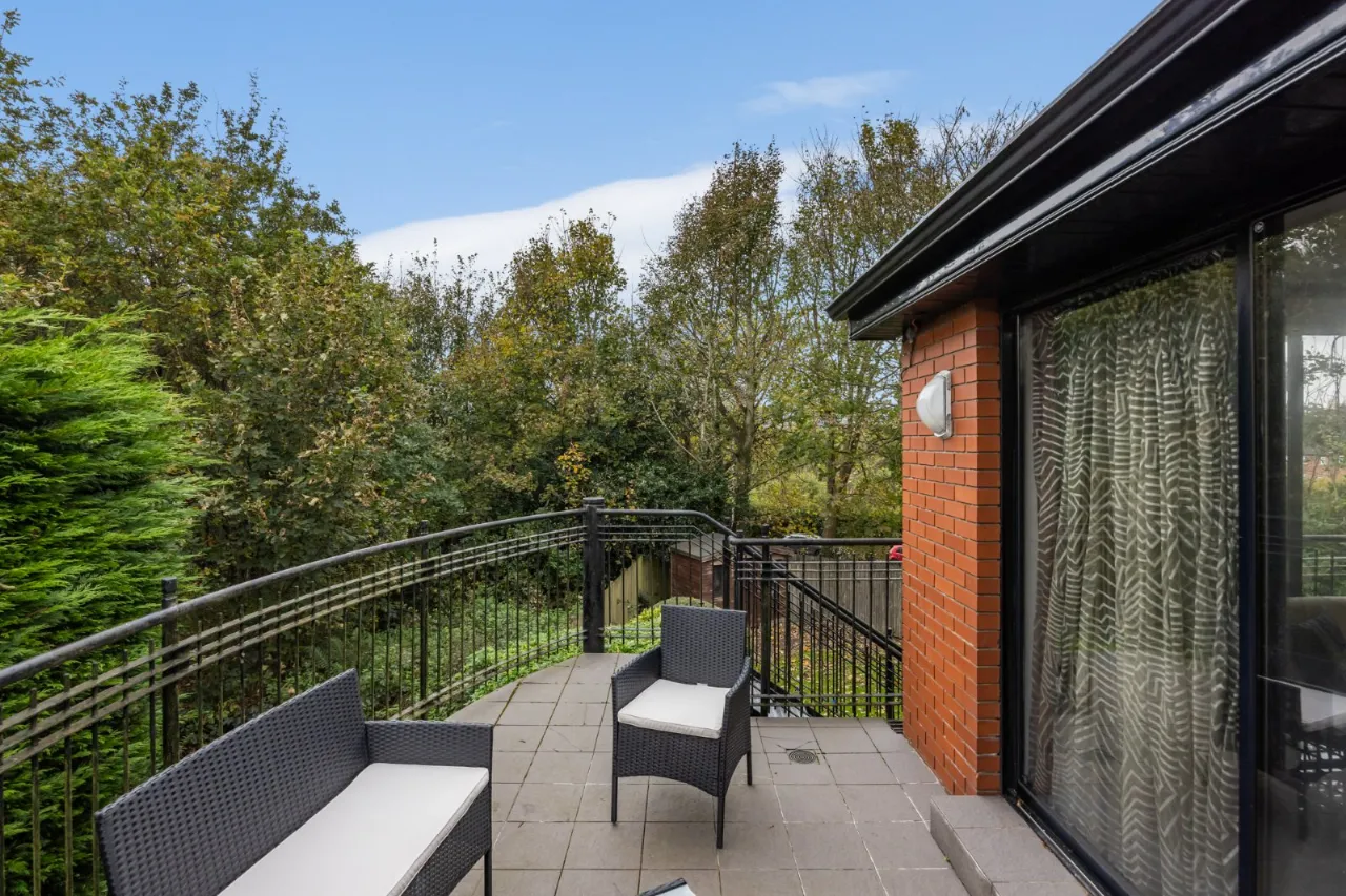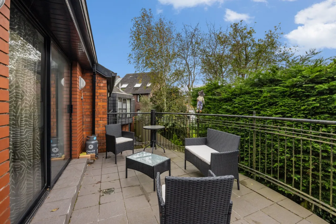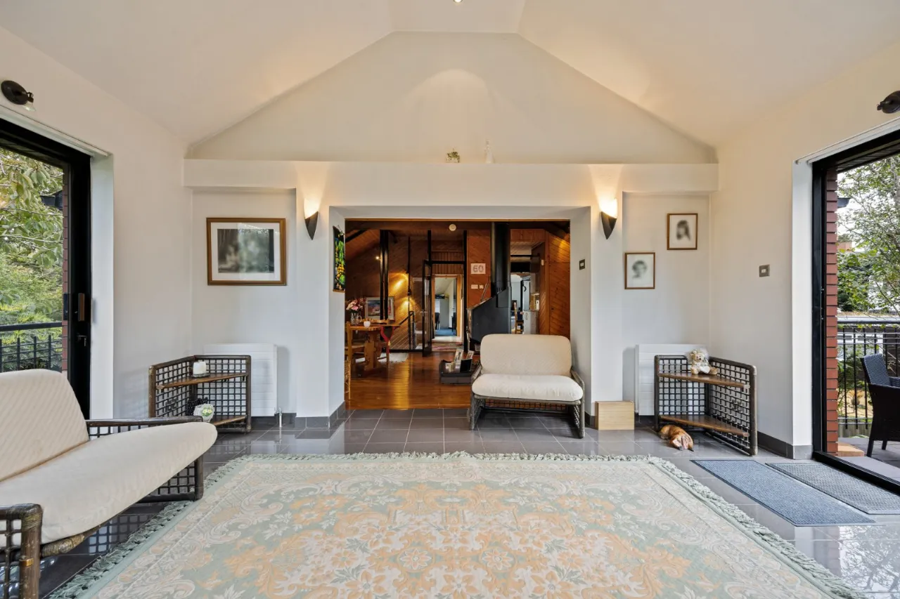 Vaulted Ceiling. Sliding doors to the left leading to a large private balcony with steps to the gardens.
