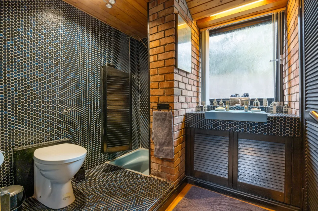 Comprising shower cubicle with chrome shower fittings, low flush w/c, wash hand basin with storage below, hot press with large storage, part tiled and part exposed brick walls, wood flooring, wood panelled ceiling.