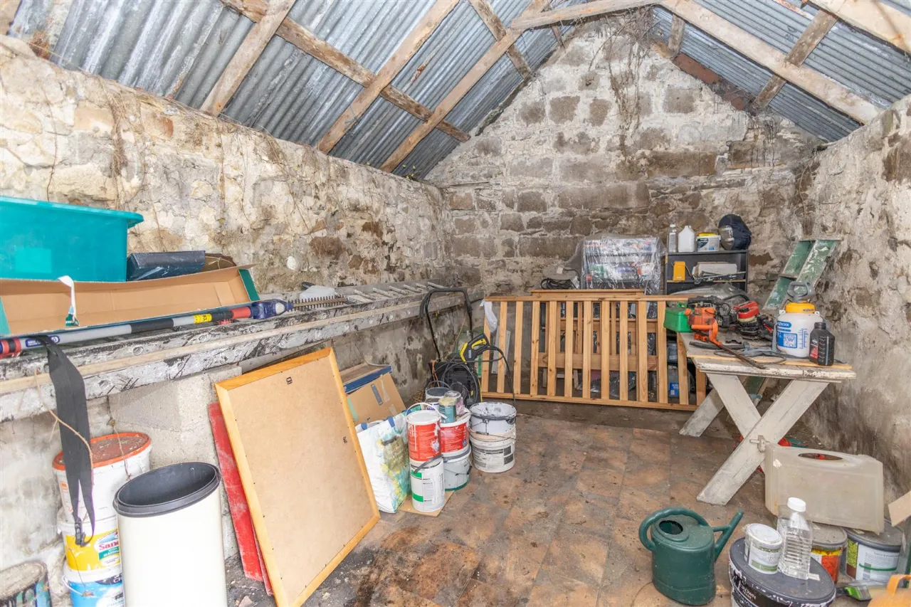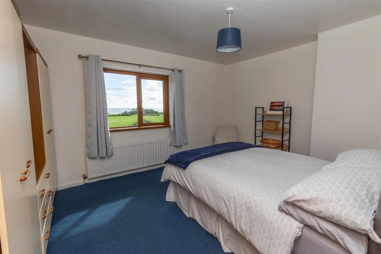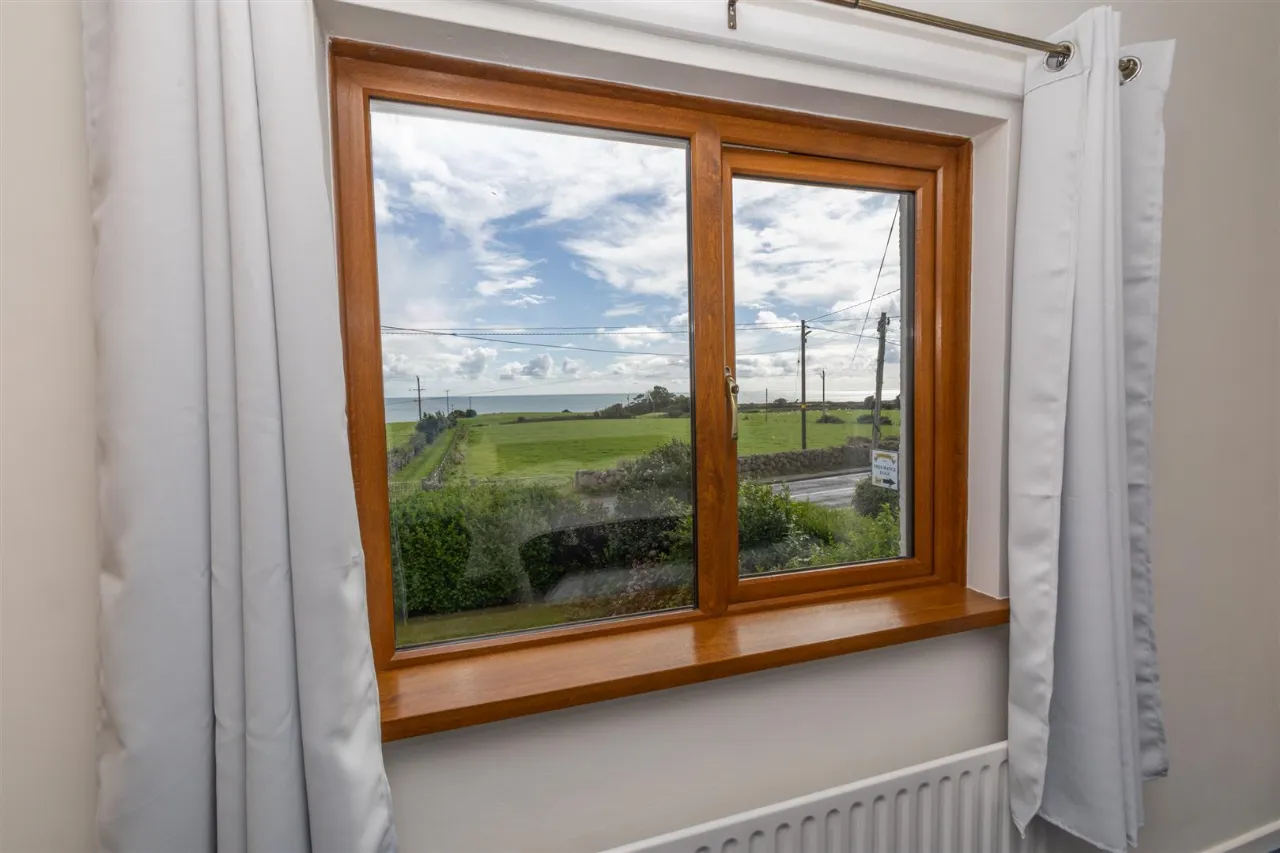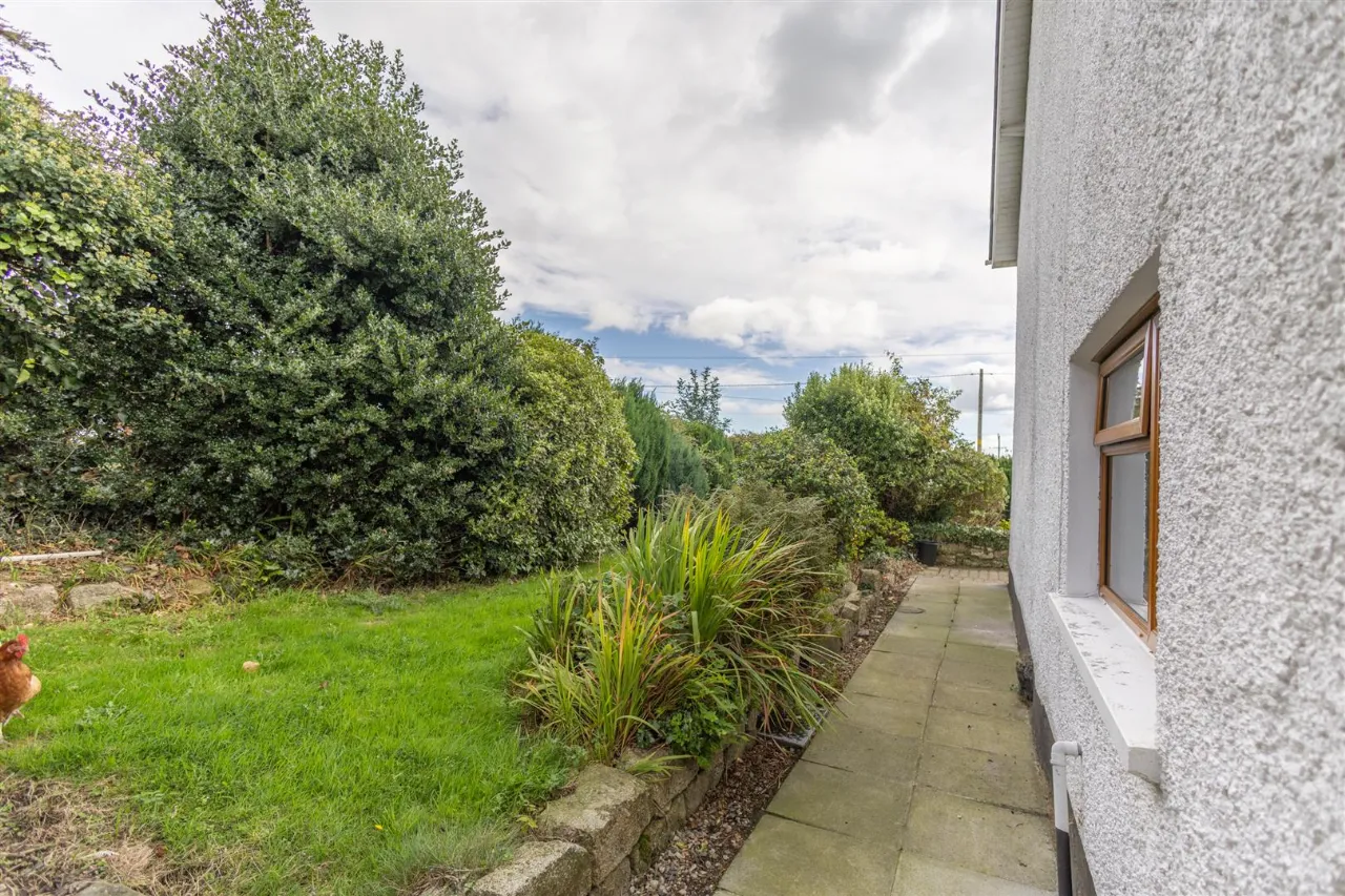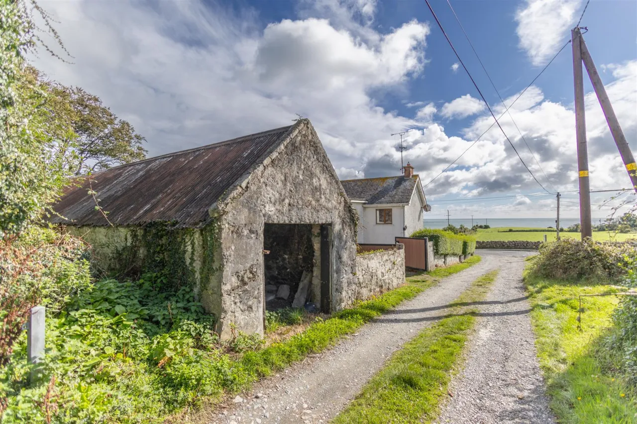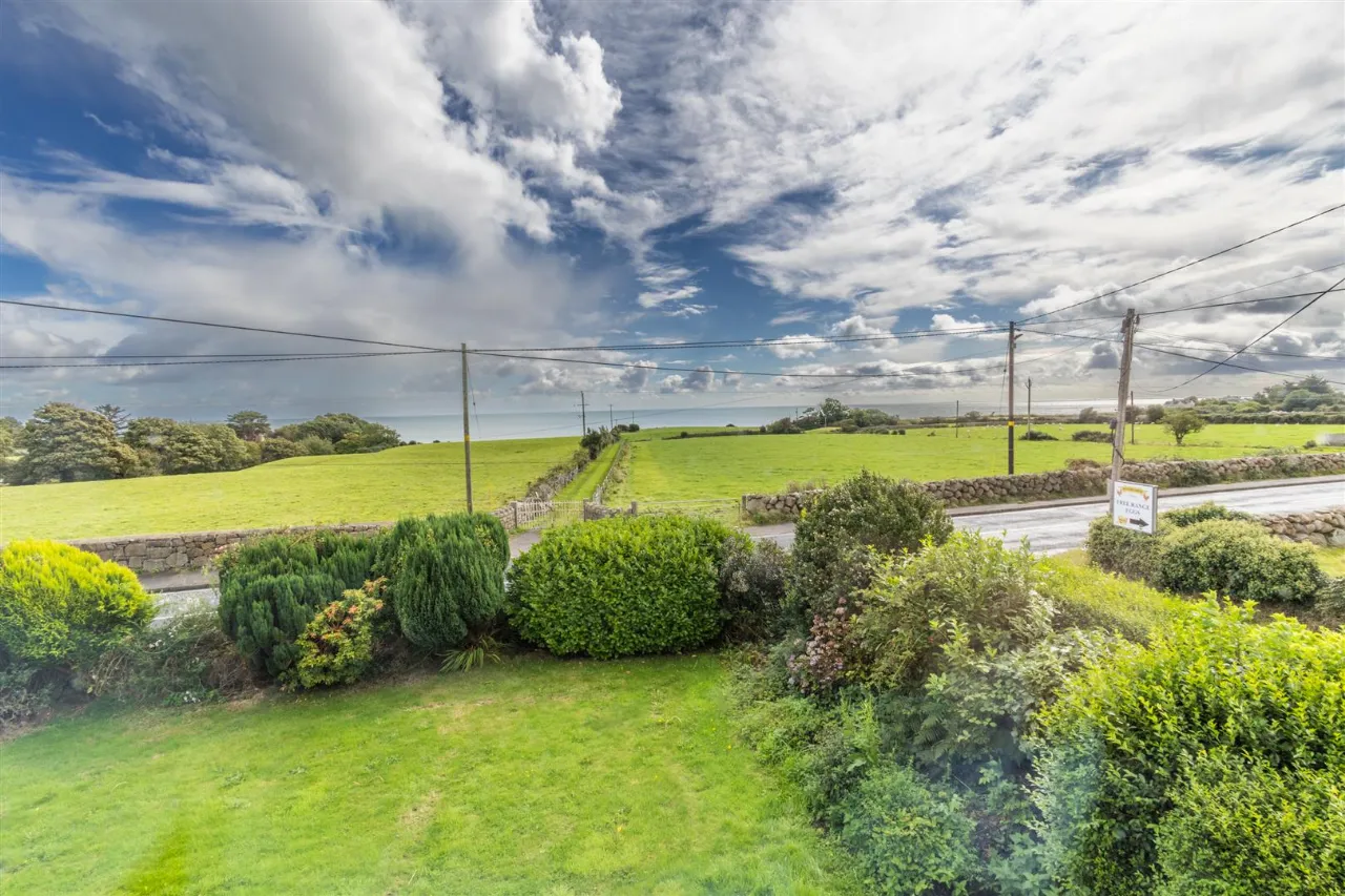 Sea views to the front with a lawned garden bordered by mature shrubs/hedging and a stone boundary wall. Brick-paved path and slabbed rear yard. Rear steps lead to fully enclosed off-street parking with gated access and a gravel parking bay. Useful outbuildings for storage.