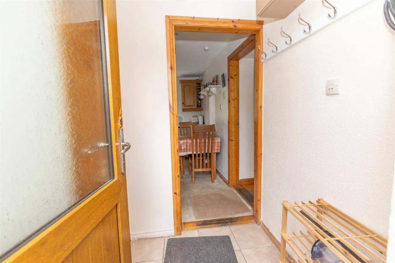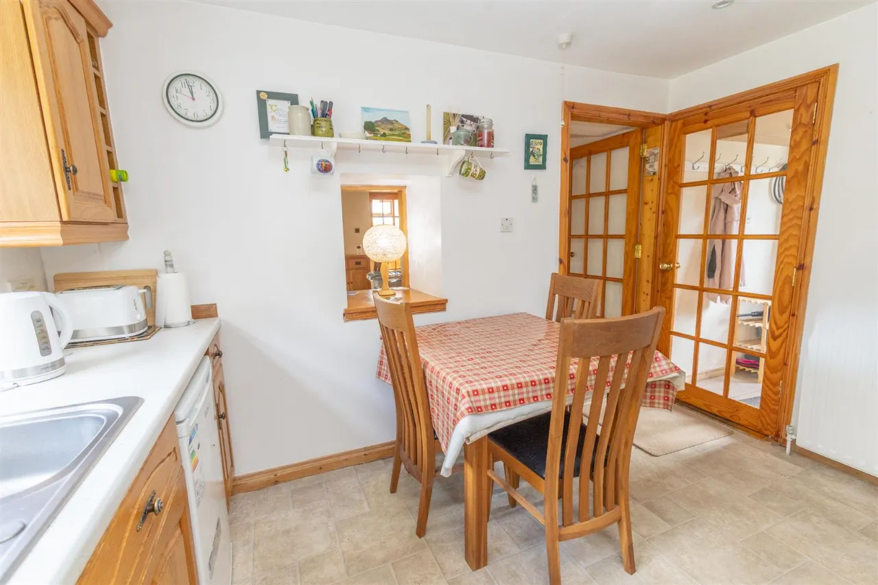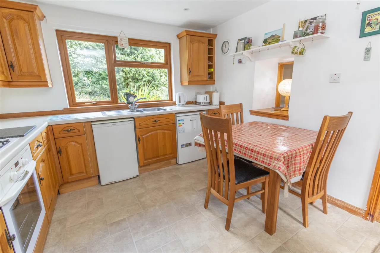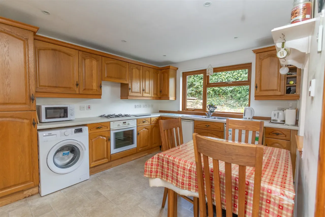 Vinyl flooring; range of upper and lower units with laminate work surfaces; one-and-a-half bowl stainless steel sink and drainer; space for washing machine, fridge, oven and hob with extractor hood above, and dishwasher; TV point.