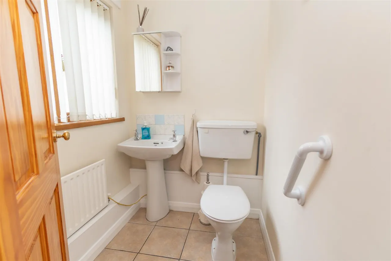 Tiled flooring; white suite comprising WC and wash hand basin with vanity mirror above the sink. and a single radiator.