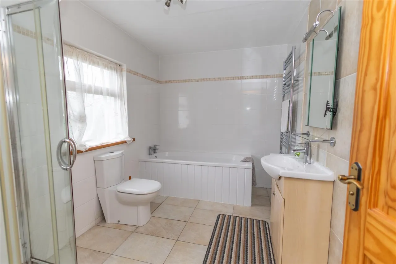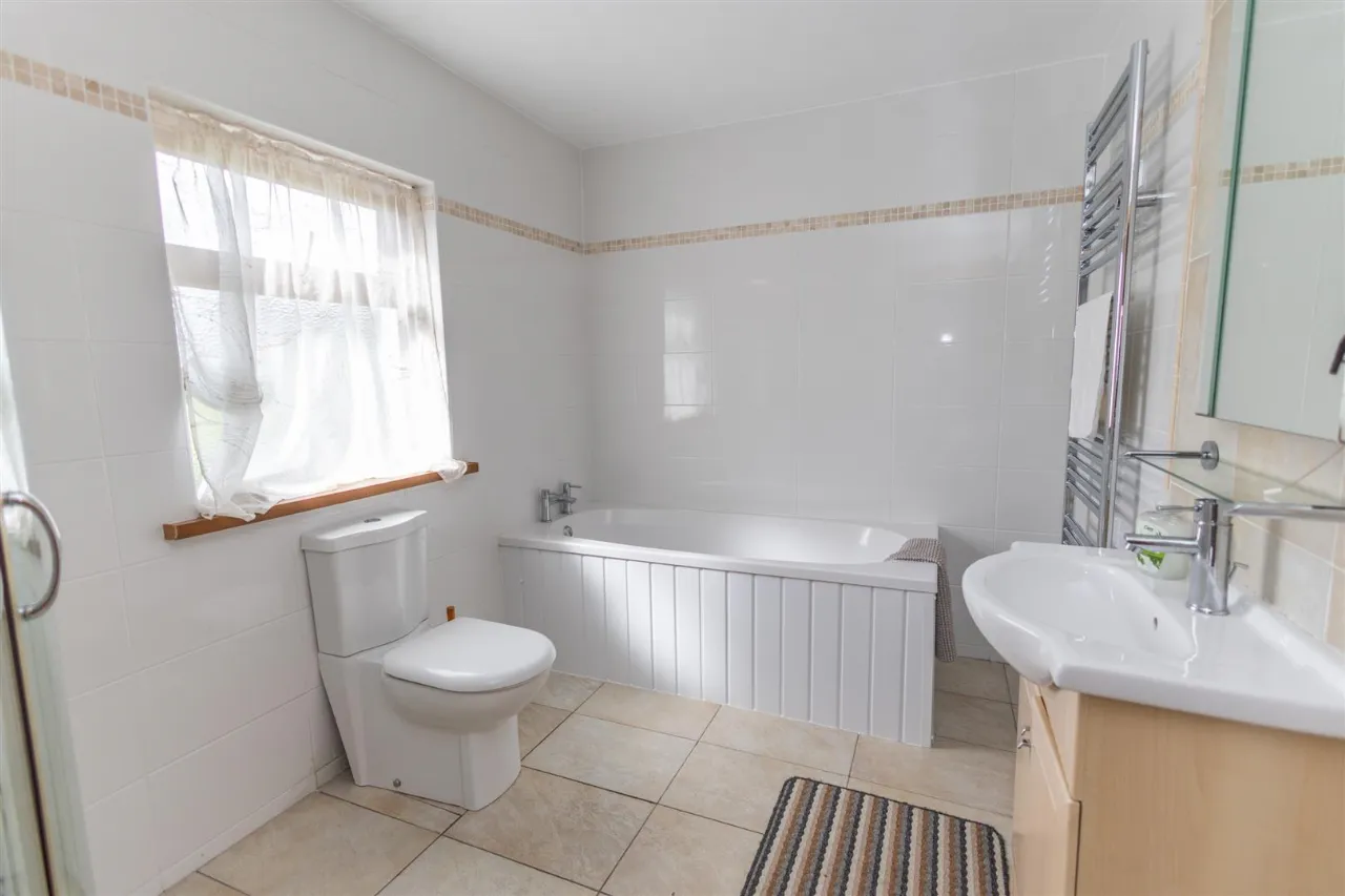 Tiled flooring; fully tiled walls; white suite comprising WC and wash hand basin set within a vanity unit with wall-mounted mirror above; panelled bath; corner enclosed shower with Triton electric unit; heated towel rail.