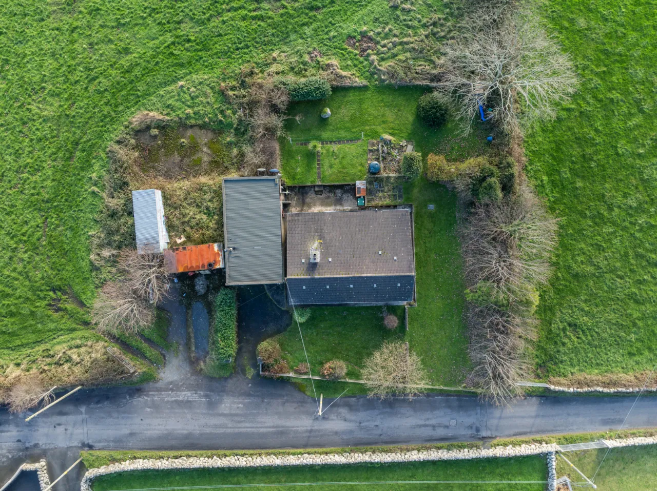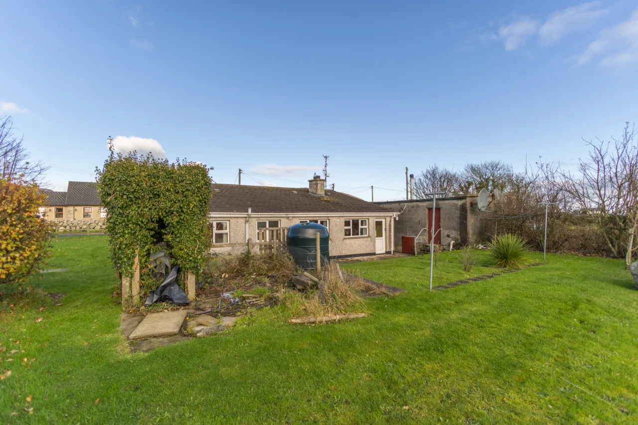 Exterior with front and rear garden laid in lawn, a small well to the side, and a detached concrete storage unit with electricity, plumbing, and drainage. Off-street parking.