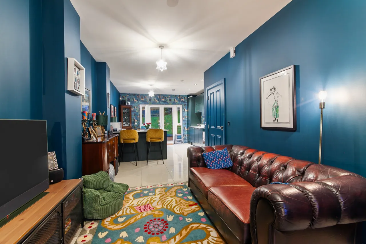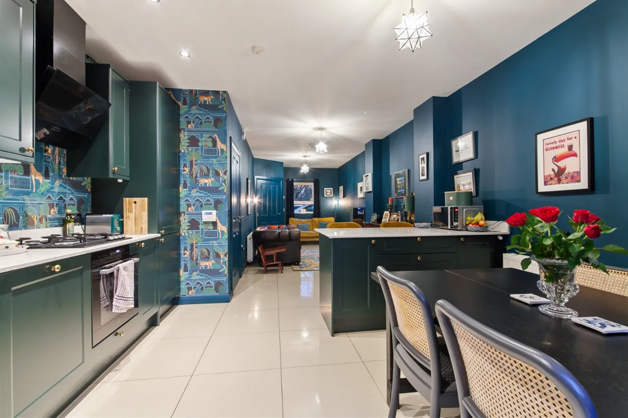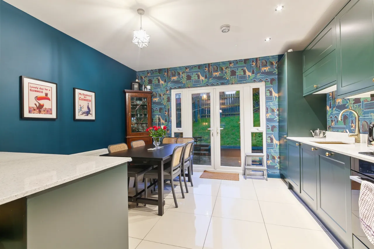 Excellent range of high and low level Quartz work tops, one and a half bowl sink unit with mixer tap, four ring gas hob and overhead extractor hood. Under bench oven, integrated fridge and freezer, integrated dishwasher, integrated washing machine, breakfast bar for casual dining and hosting. Formal dining space and patio doors to rear garden.