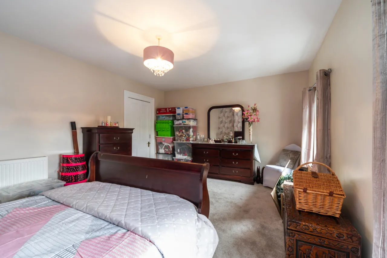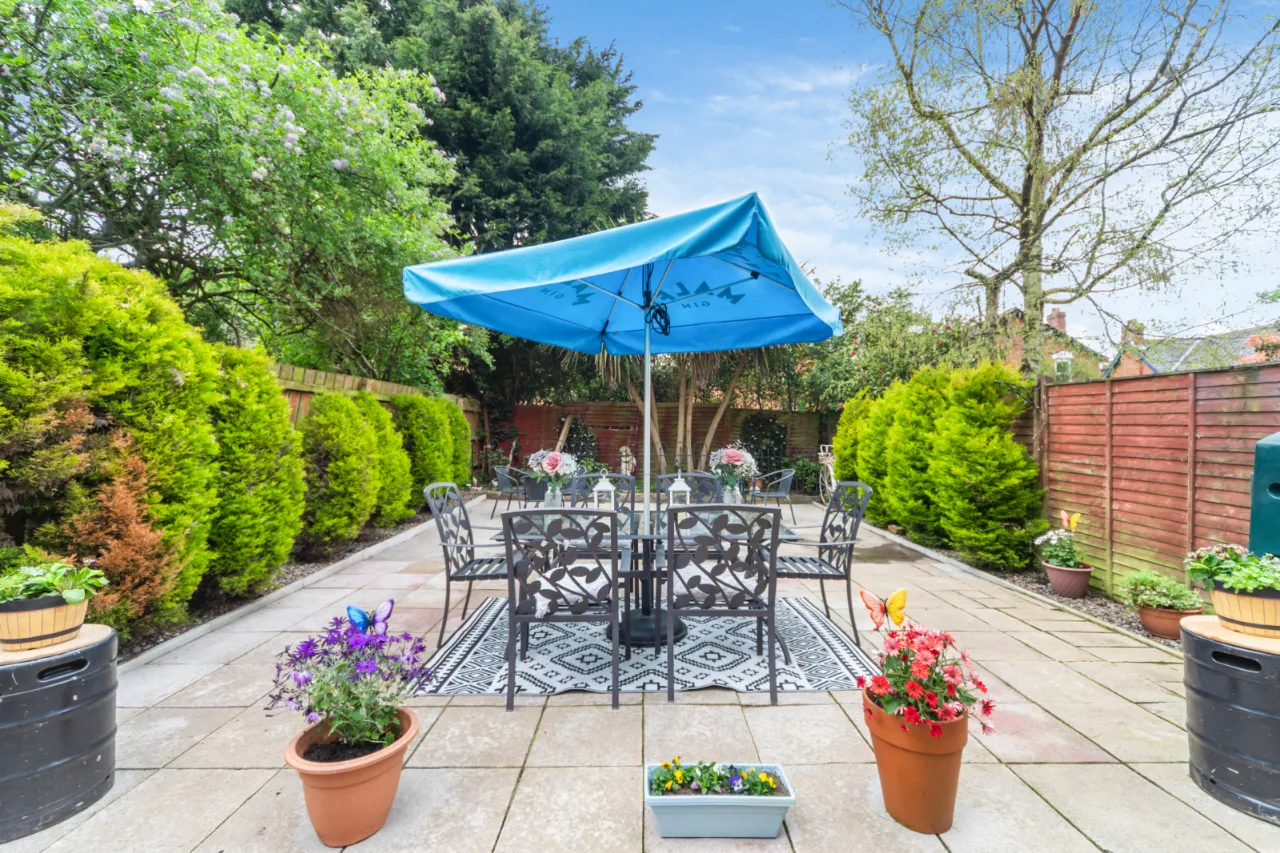 Enclosed rear garden with pleasant range of shrubbery, trees, patio and hedging. Enclosed bin storage, bordering fencing and hedging, outside tap, light and electric points.