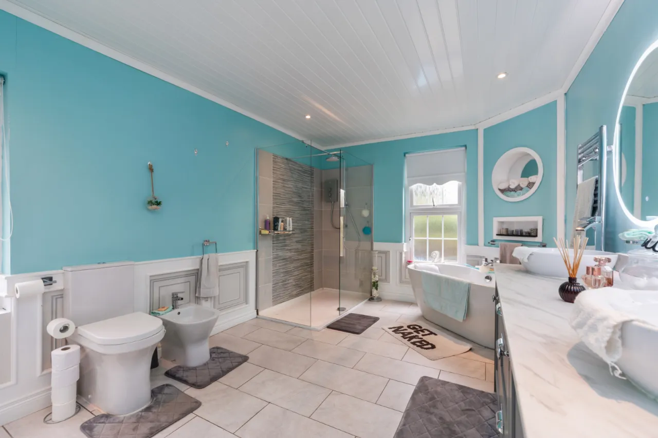 Comprises of free standing bath with mixer tap, walk in shower with glass shower screen and tiled walls. His and hers sink units with mixer taps and large vanity storage unit. Low flush WC with push button flush, bidet with mixer tap, tiled floor, recessed lighting and chrome heated towel rail.