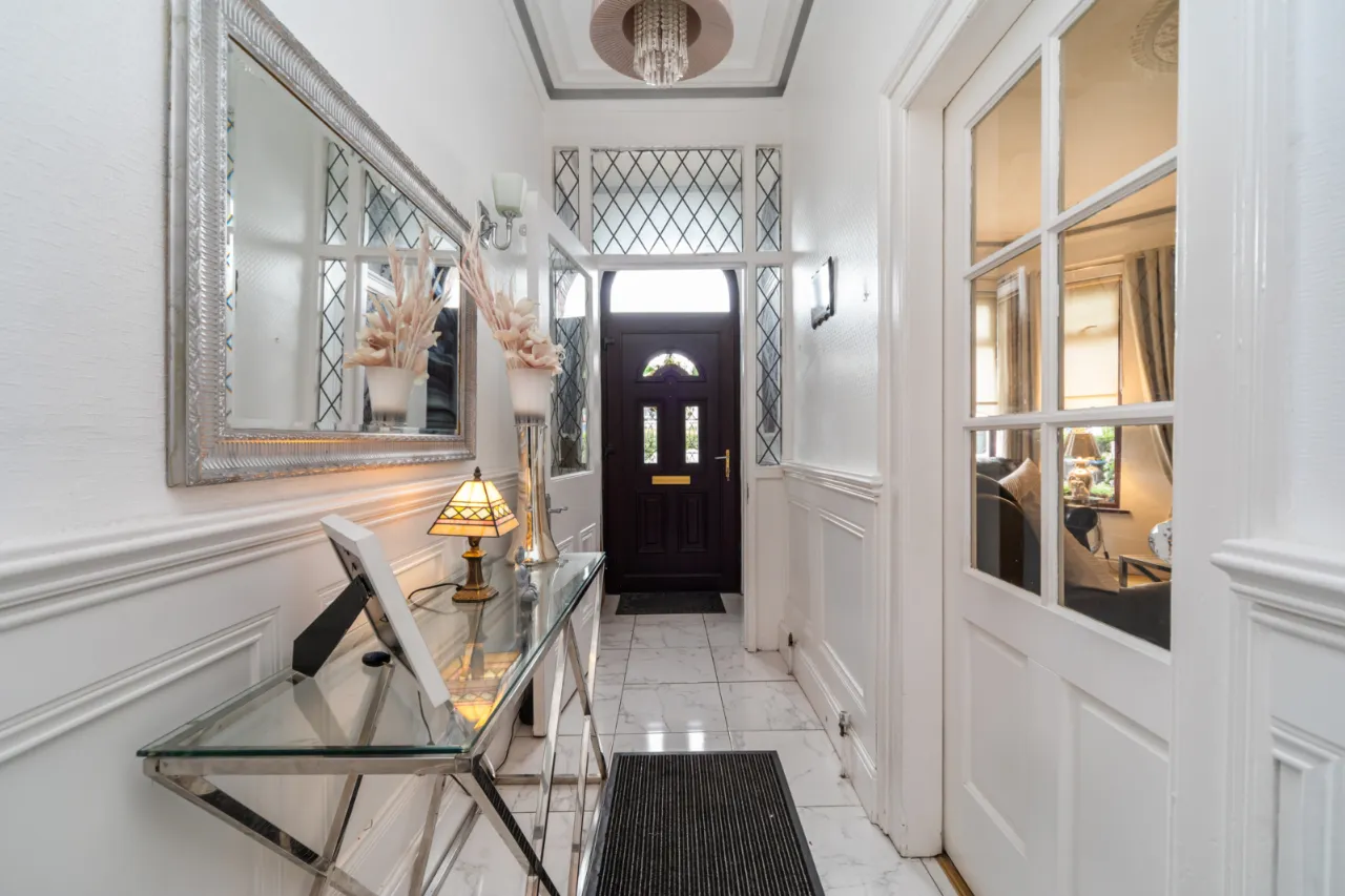 Ceramic tiled floor, wall paneling and corniced ceiling. Inner wooden door with glass side panels.