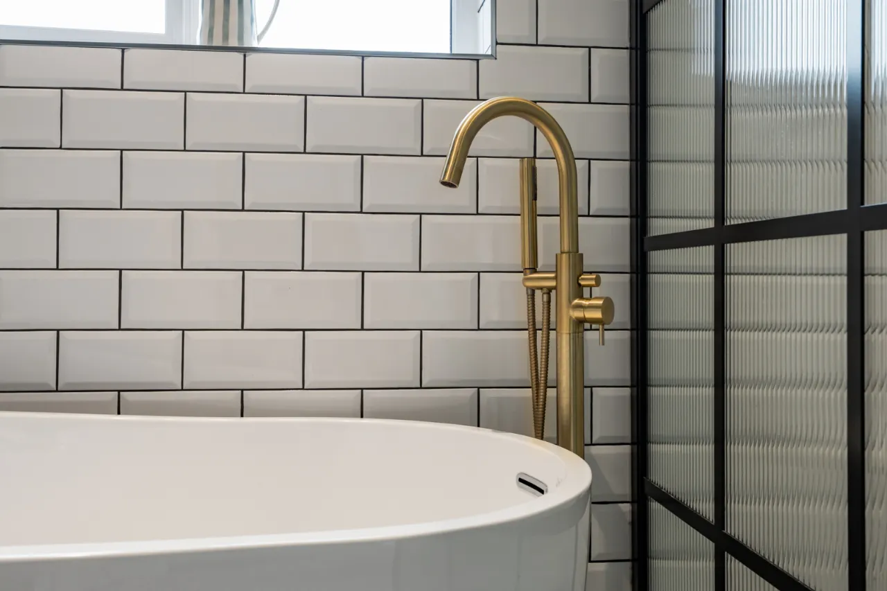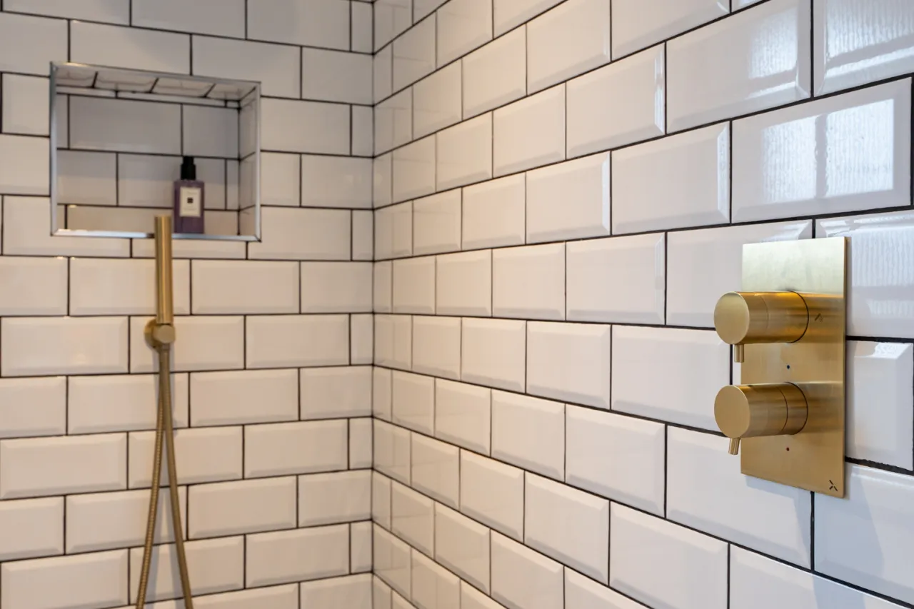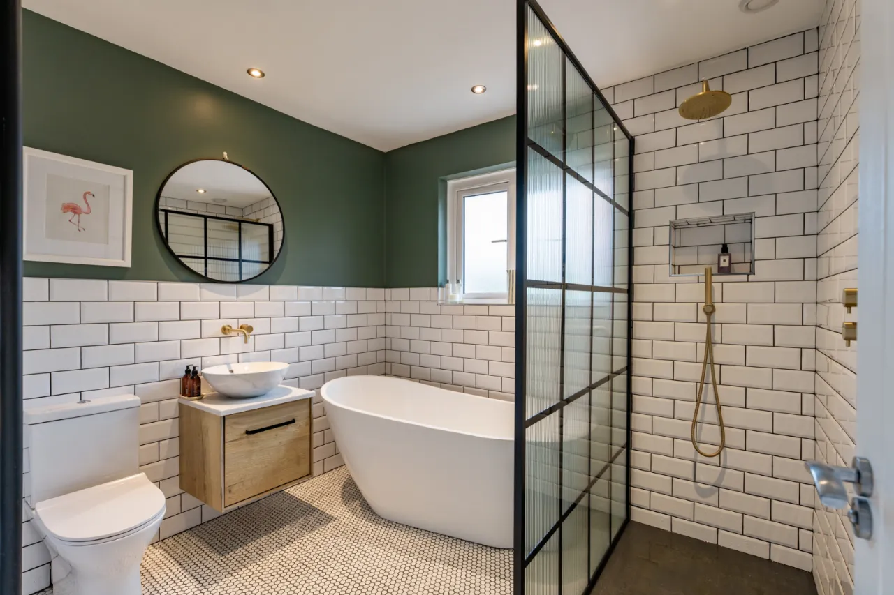 Contemporary Bathroom Suite comprising of free standing bath, walk in shower with inset shelving, ceramic bowl sink unit and wall mounted vanity storage underneath. Low flush WC, heated towel rail, partly tiled wall and tiled floor. Recessed lighting and extractor fan.