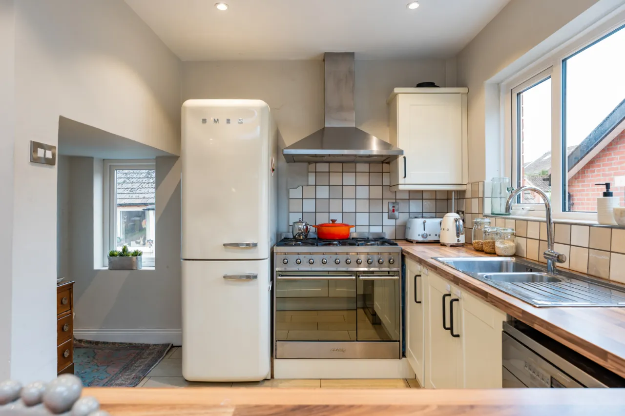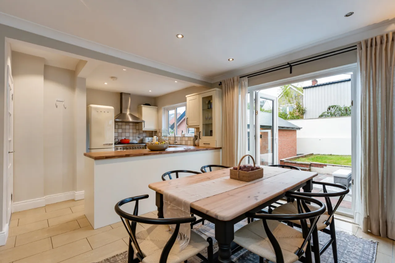 Kitchen comprises of a range of high and low level units and feature breakfast bar for casual dining. Single bowl sink with mixer tap and drainer. Plumbed for dishwasher, space for fridge and freezer, space for six ring gas hob and free standing Smeg cooker. Overhead stainless steel extractor hood, partly tiled walls, fully tiled floor, recessed lighting, open plan into dining room, feature fireplace (Open) and patio doors into garden.