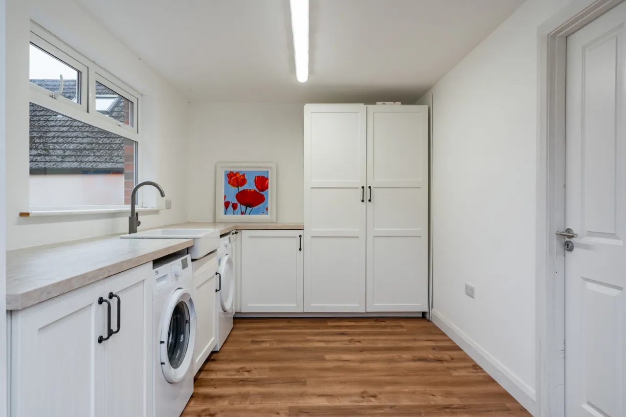 Comprises of high and low level units, Belfast sink unit with mixer tap and plumbed for washing machine. Space for tumble dryer and laminate wooden floor.