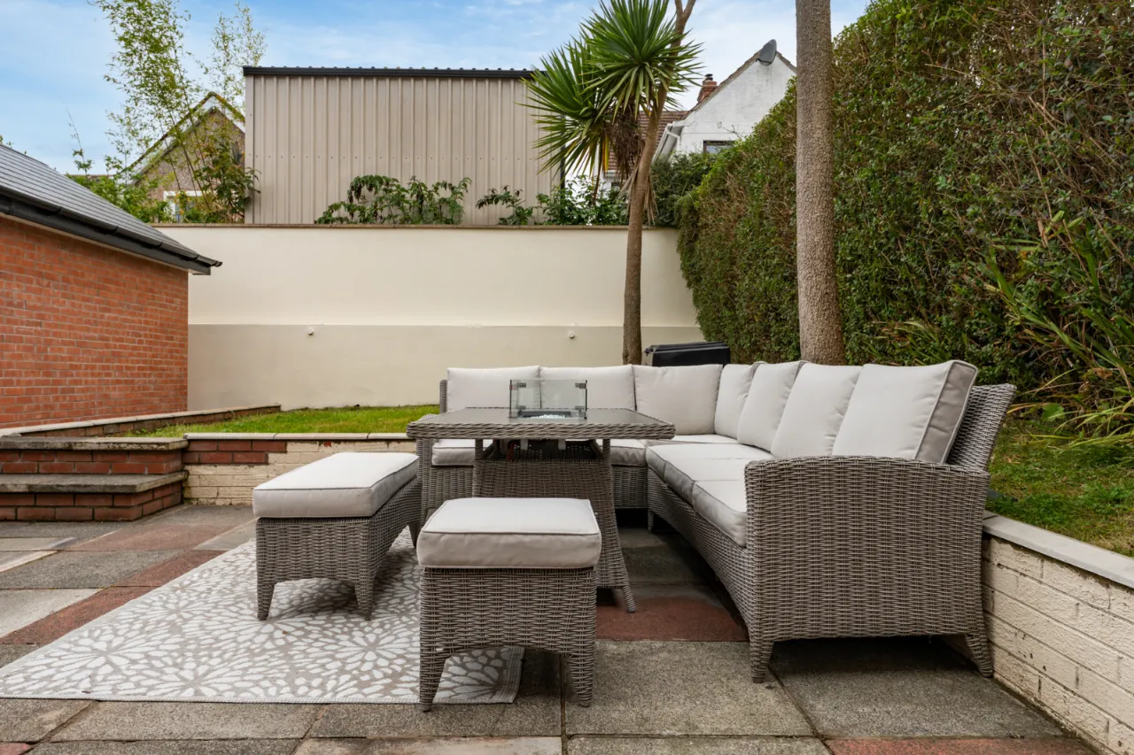 South /West facing rear garden laid in lawn, patio area, fully enclosed with bordering fencing, hedges and walls. Outside light and tap. Views over Cavehill.