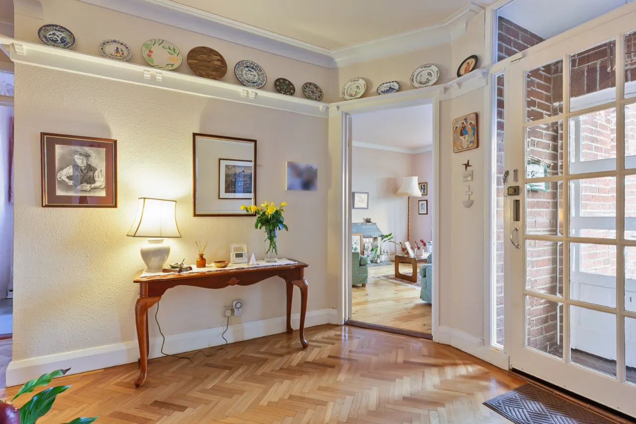 Herringbone wooden floor, plate rail, corniced ceiling and under stair storage.