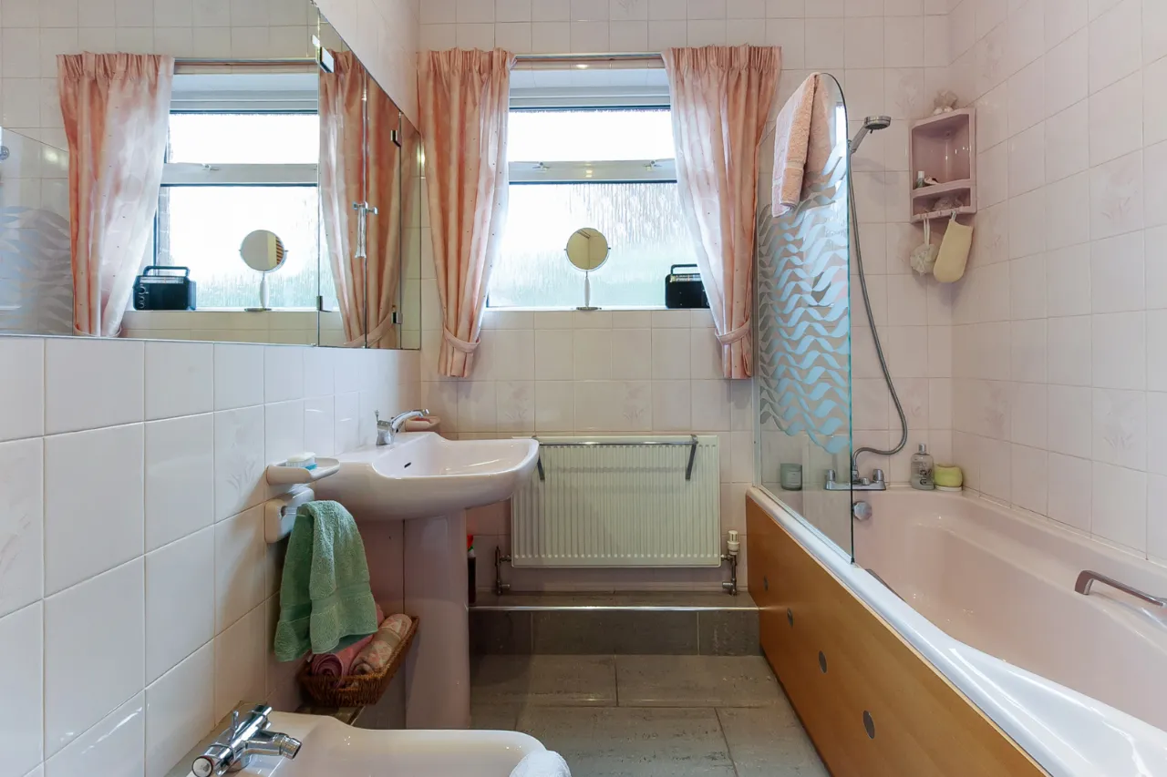 Comprises of paneled bath with overhead shower and glass shower screen. Pedestal wash hand basin with mixer taps, bidet, tiled floor and walls. Linen cupboard.