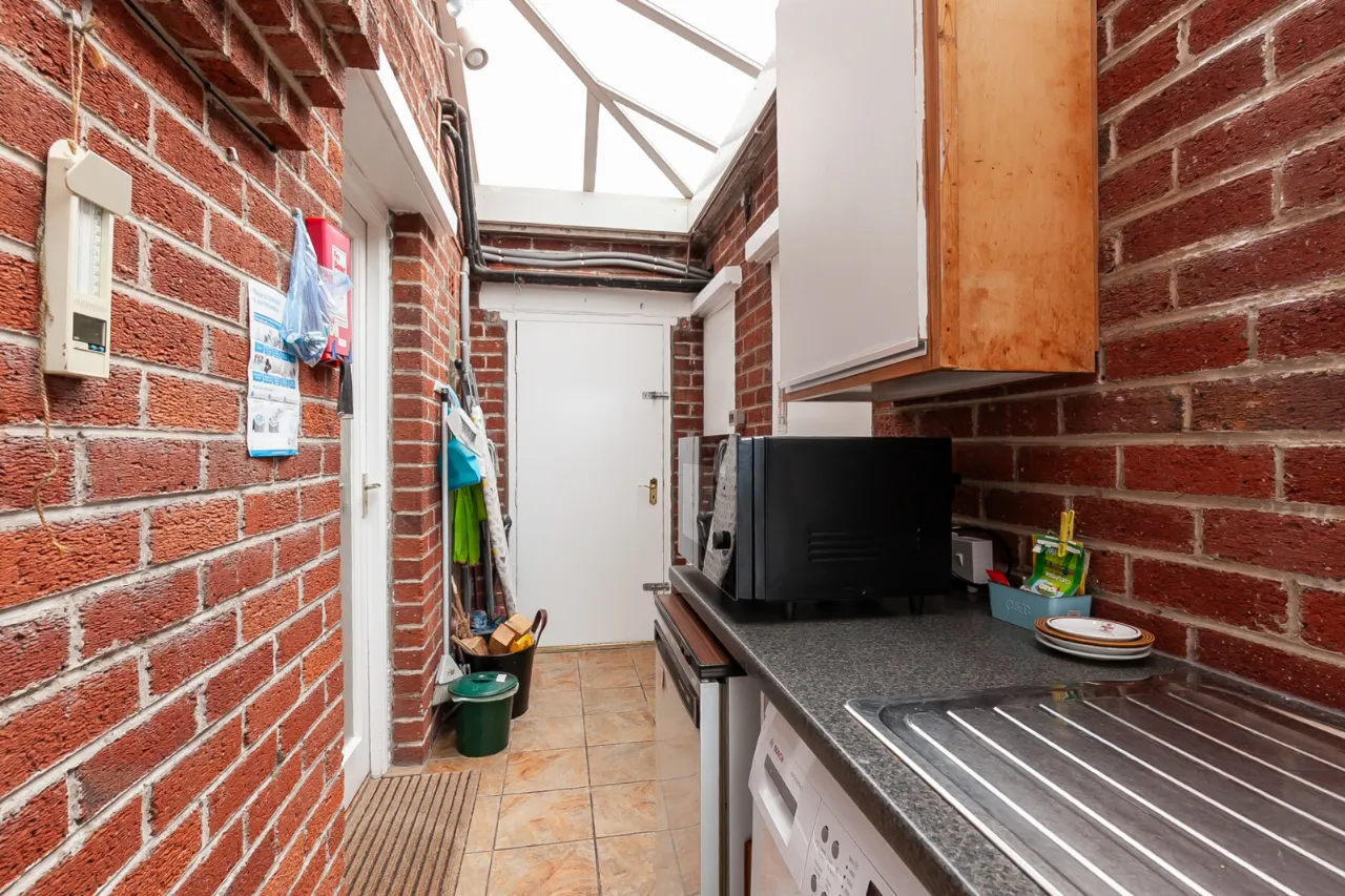 High and low level units, single bowl sink unit with mixer tap, plumbed for washing machine, space for tumble dryer, space for fridge and freezer, boiler storage and additional storage. Access to rear and garage.