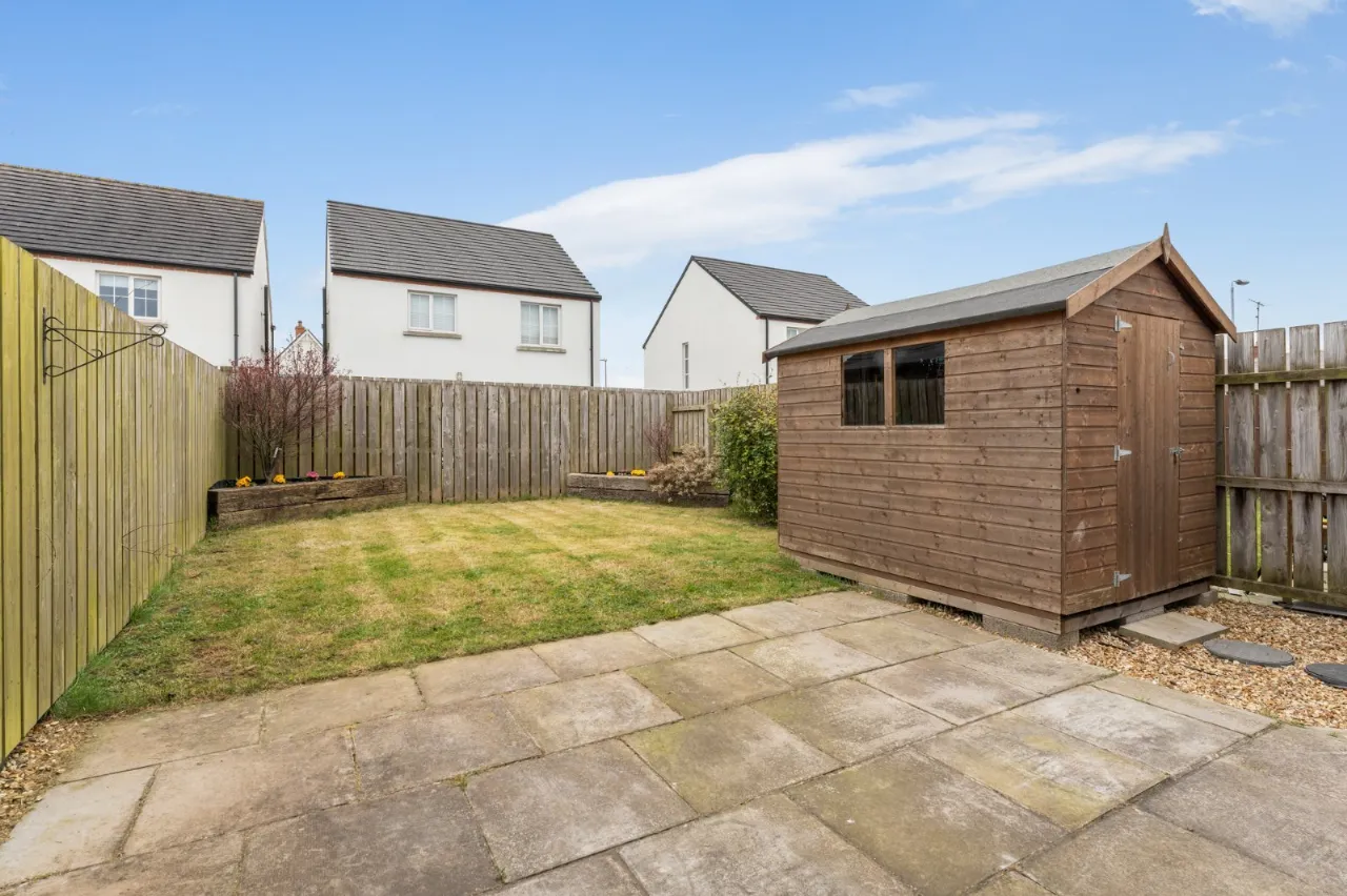 Driveway parking for multiple vehicles and spacious enclosed rear garden with flagged patio area and lawn.