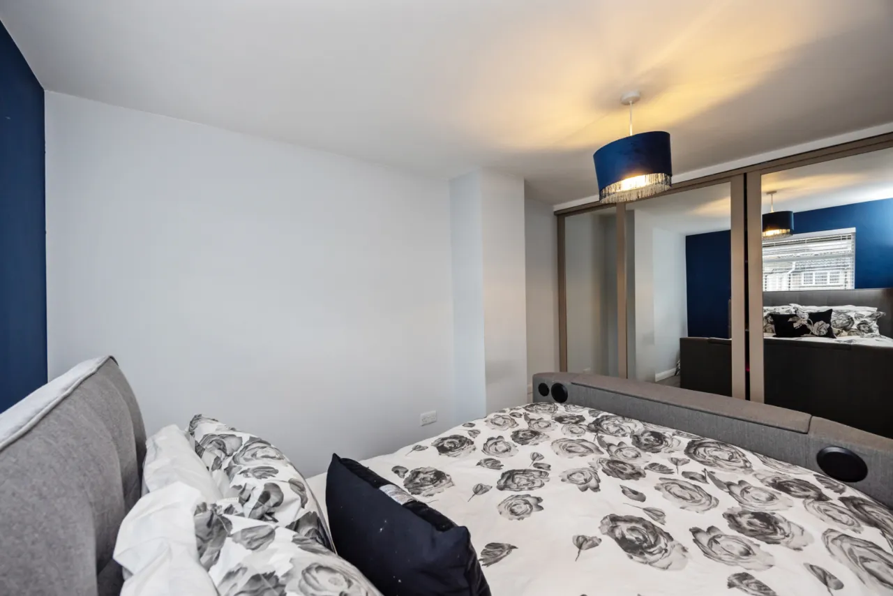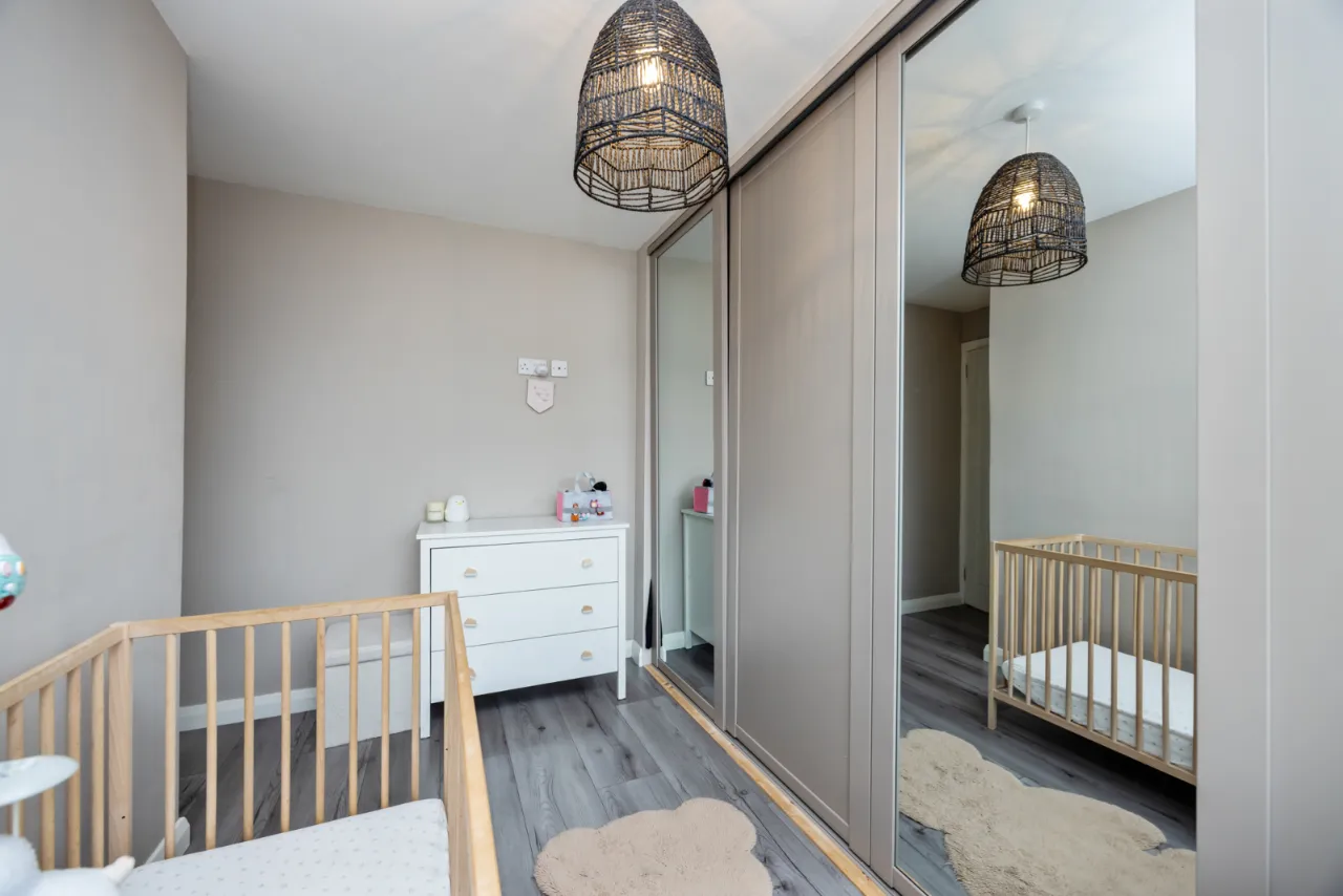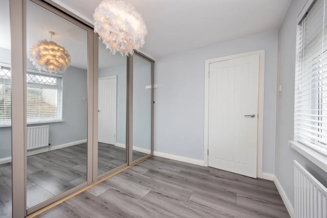 Built in wardrobes with mirrored sliding doors, wood laminate floor.