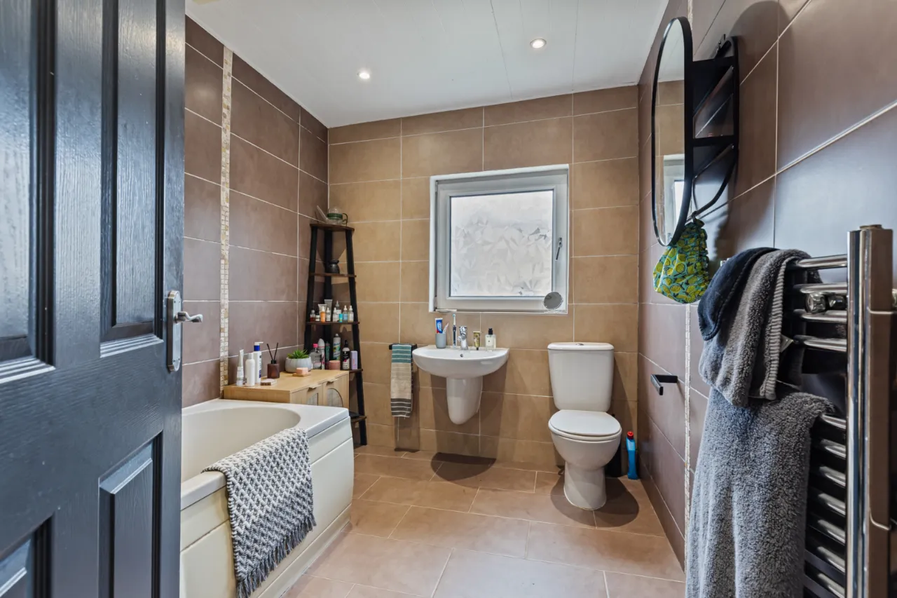 White suite comprising panelled bath with shower fitment. Semi-pedestal wash hand basin. Low flush WC. Fully tiled walls. Ceramic tiled floor. Chrome heated towel radiator.