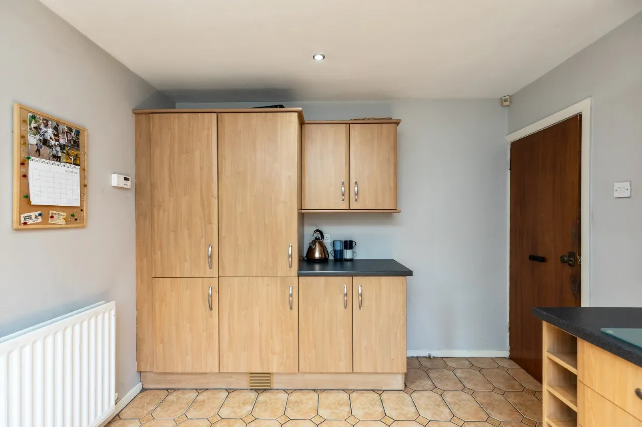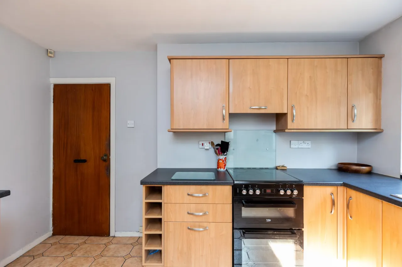 Full range of high and low level units, 4 ring ceramic hob and under oven, extractor hood over, stainless steel single drainer sink unit with mixer taps, built in fridge freezer, dishwasher, ceramic tiled floor.