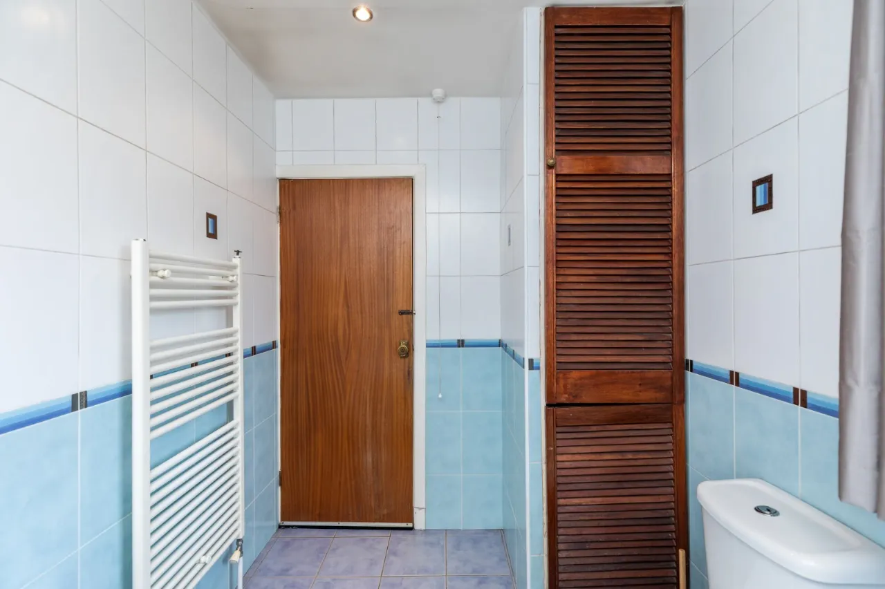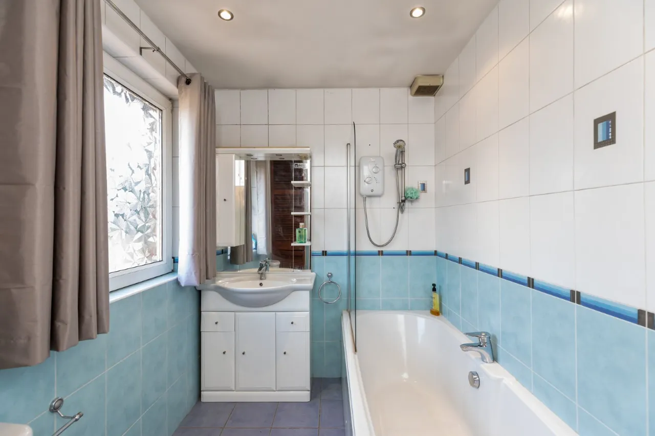 White suite comprising: Panelled bath with mixer taps and instant heat electric shower unit, low flush WC, fully tiled walls, ceramic tiled floor, chrome towel radiator.