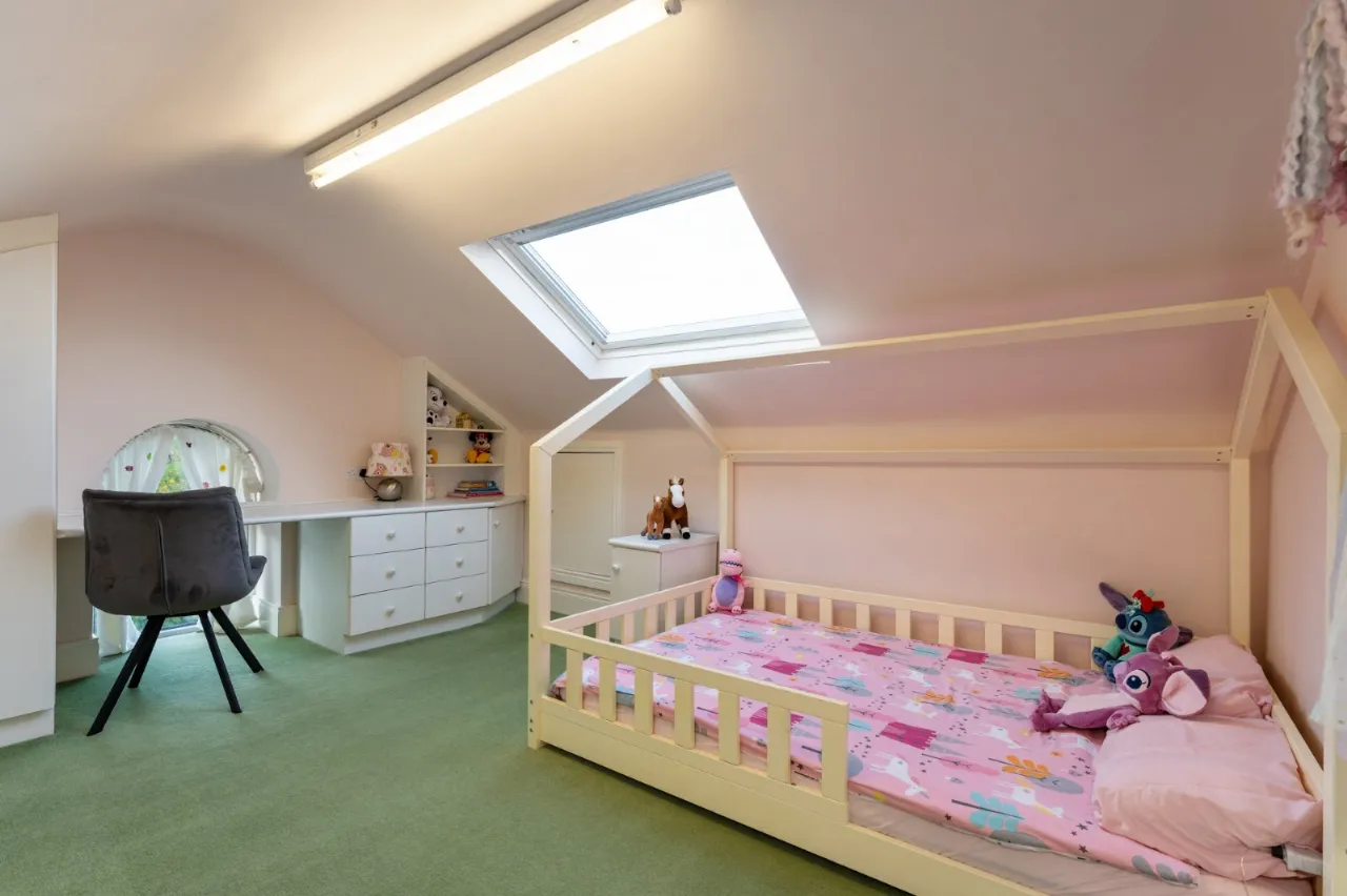 Large eaves storage, fitted drawers into eaves, fitted desk and wardrobe, velux window.