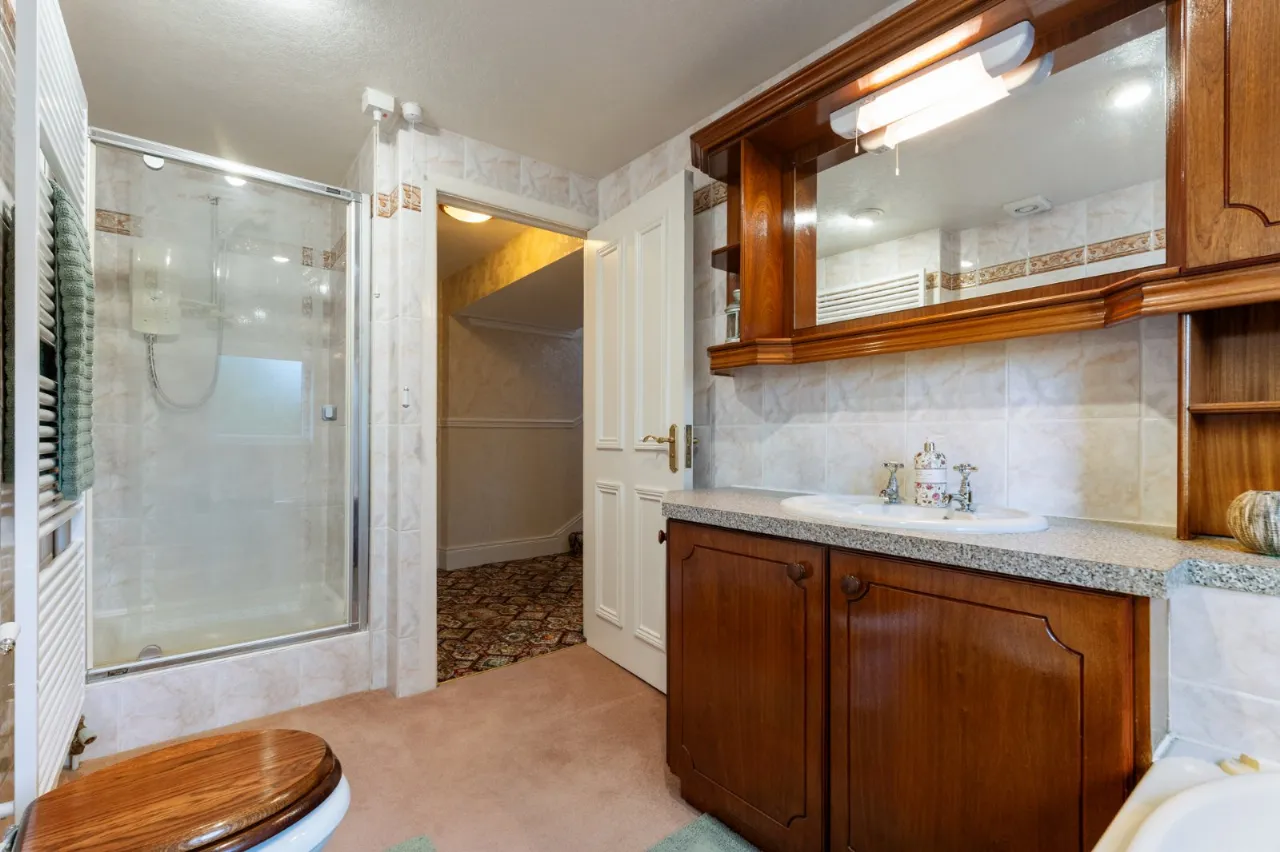 piece suite comprising of low flush WC, bidet, wash hand basin with vanity unit, panelled jet bath, tiled shower with Mira instant heat electric shower, heated towel radiator, fully tiled walls.