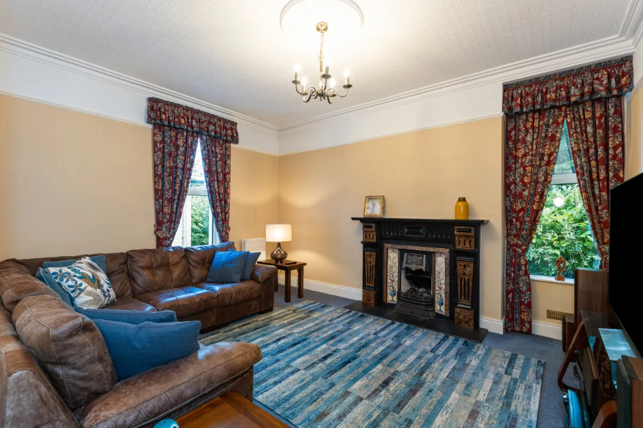 Into bay. Handcrafted marble fire surround with gas inset and marble hearth, corniced ceiling, ceiling rose.