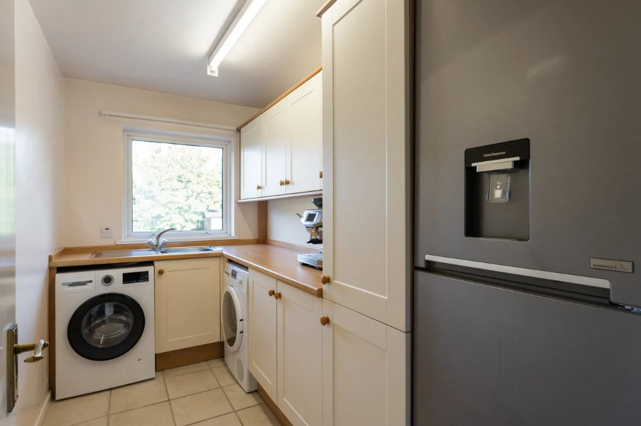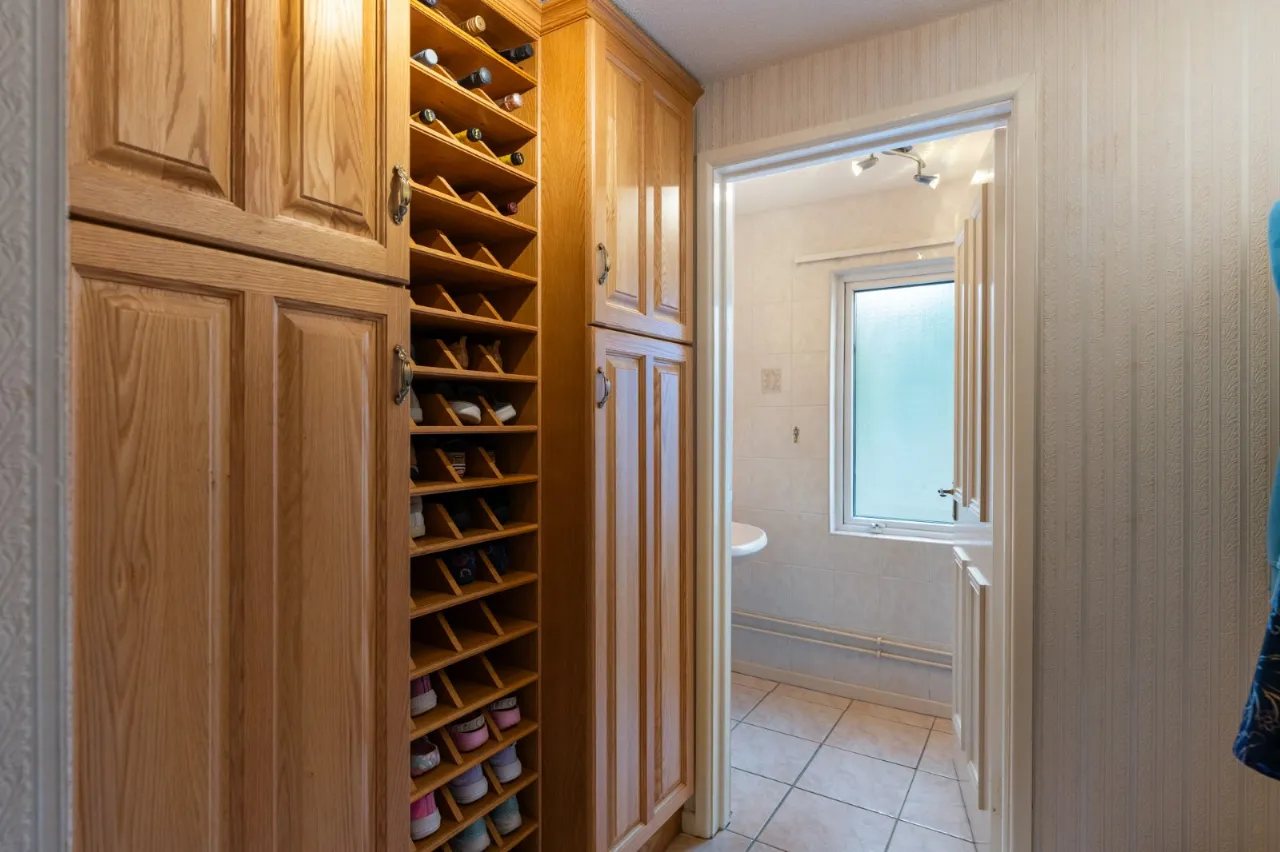 Coats and boot space, fitted cabinetry and wine rack, tiled floor.