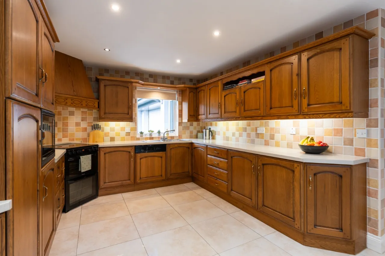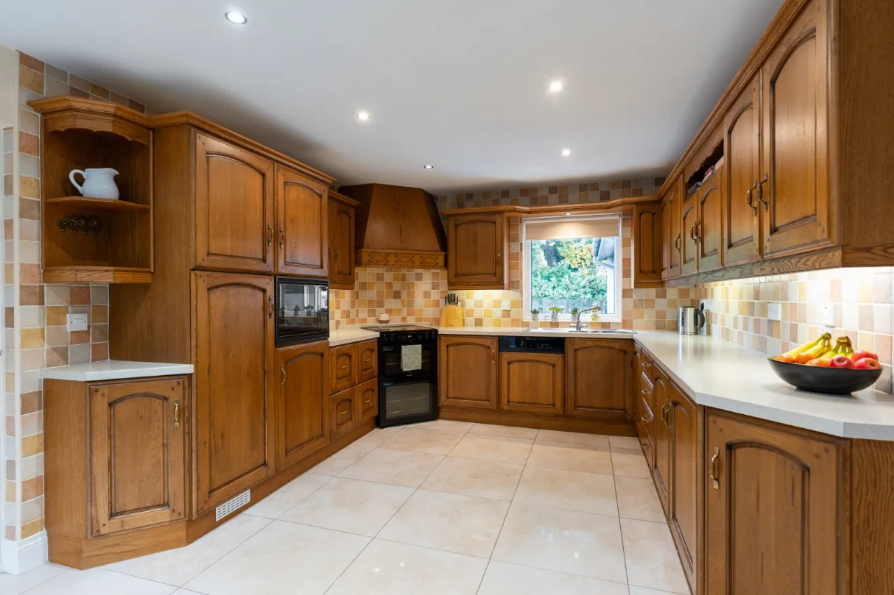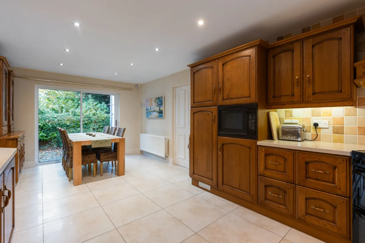 Excellent range of solid hardwood fitted units, 1.5 drainer stainless steel sink unit with mixer taps, integrated Miele dishwasher, recess for electric cooker with concealed extractor hood, integrated microwave, integrated fridge, partly tiled walls, fitted dresser with glazed units, casual dining for 6, sliding door to side, tiled floor, recessed lighting, access to annex.