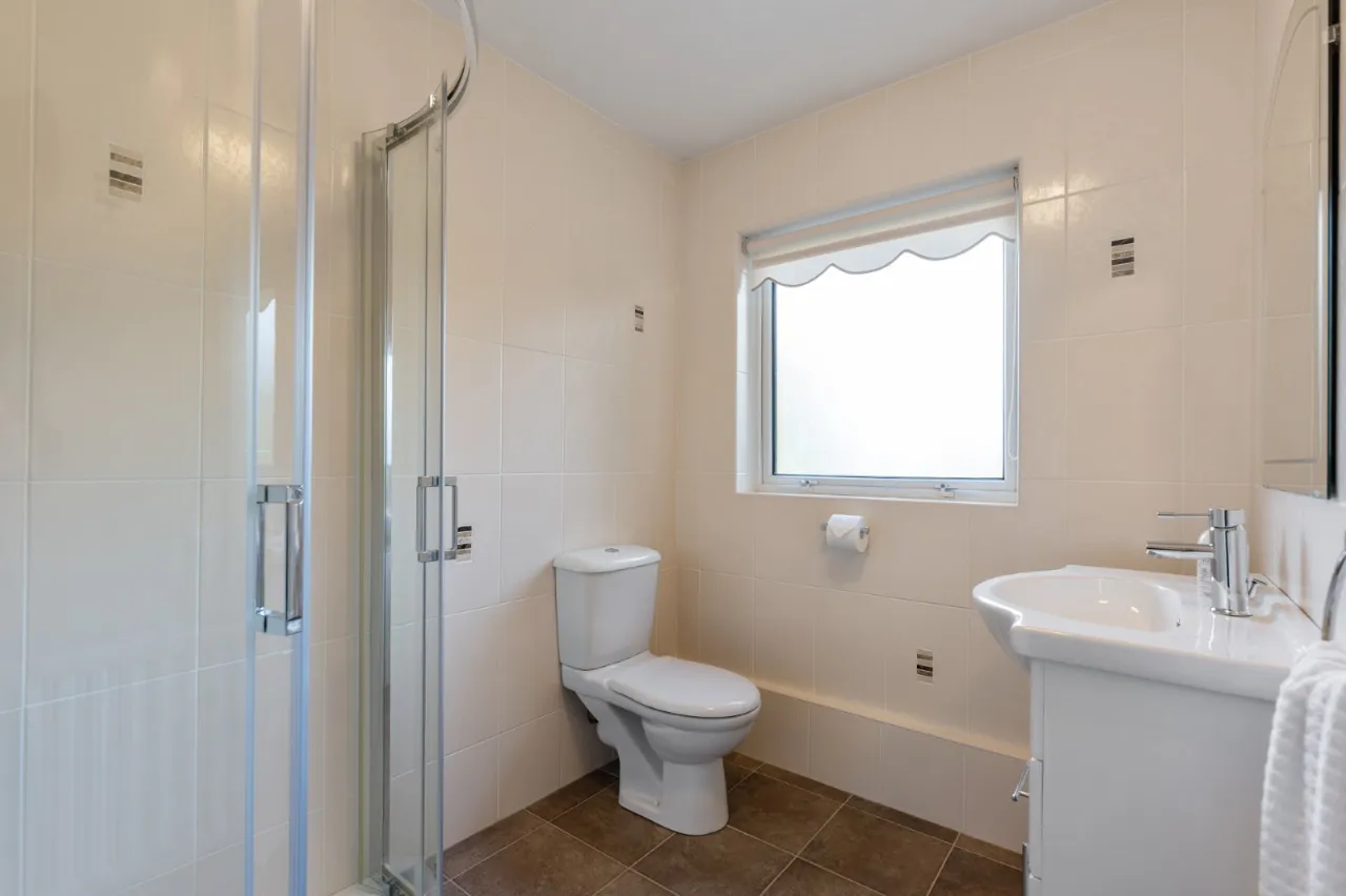 Low flush WC, wash hand basin with vanity unit beneath, corner shower with chrome thermostatic controls, tiled floor, fully tiled walls.