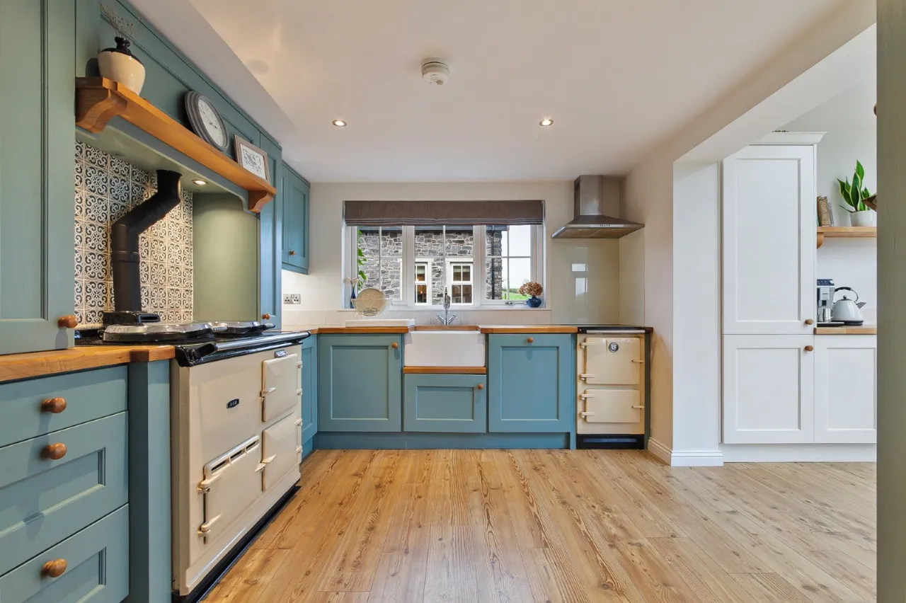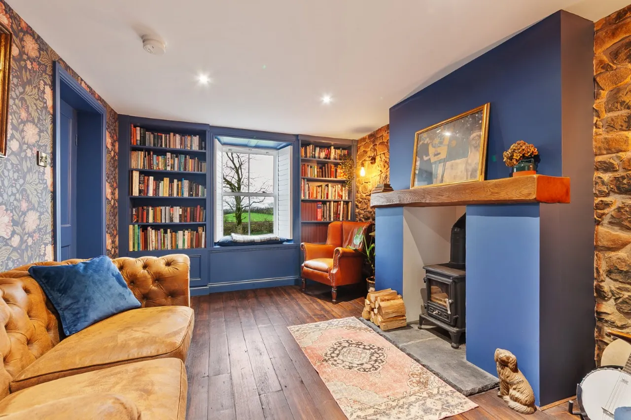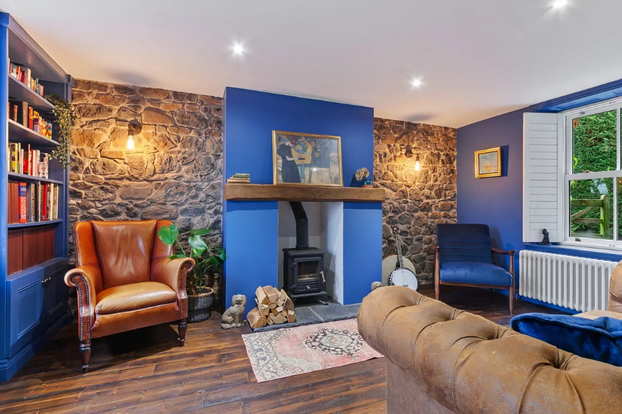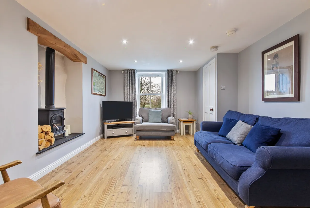 Solid wooden flooring, exposed stone walls, wood burning stove on tiled hearth