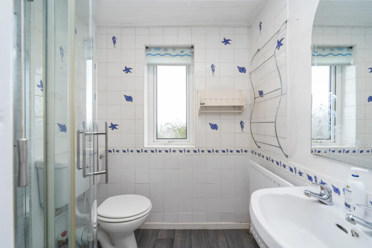 Comprises of full white suite, low flush WC, pedestal wash hand basin, enclosed corner shower unit with electric shower, laminate floor and tiled walls.