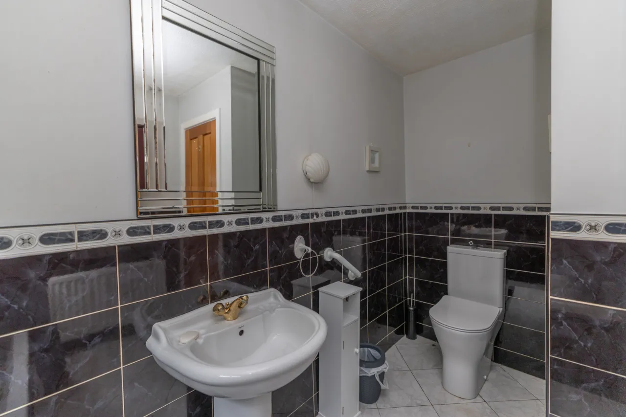 SHOWER ROOM: 5'3" x 6'4" (1.59m x 1.94m) Pedastel sink, towel rack, toilet with high and low flush, walk in electric Red Ring shower, tiled surround.