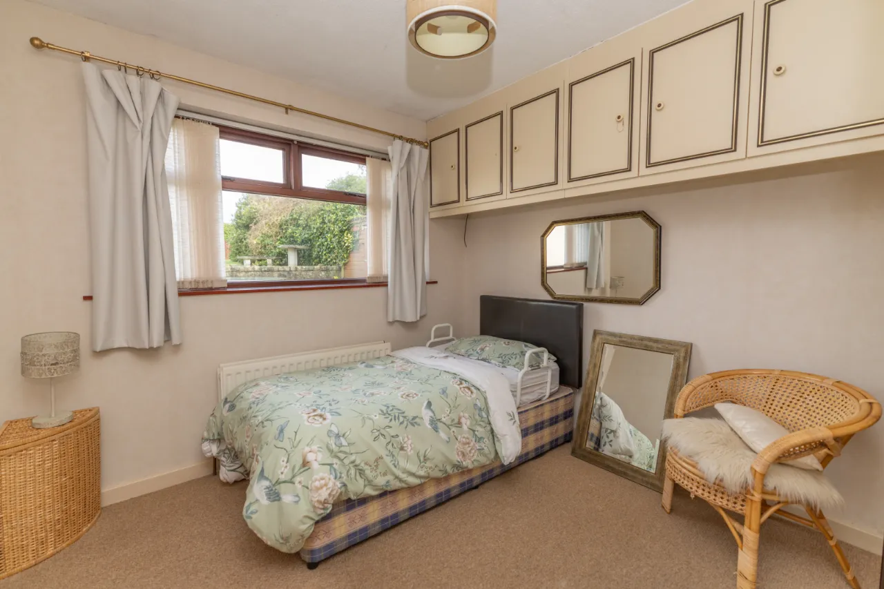 BEDROOM 4: 12'8" x 13'2" (3.85m x 4.02m) Carpetl floor, radiator, mahogany window.