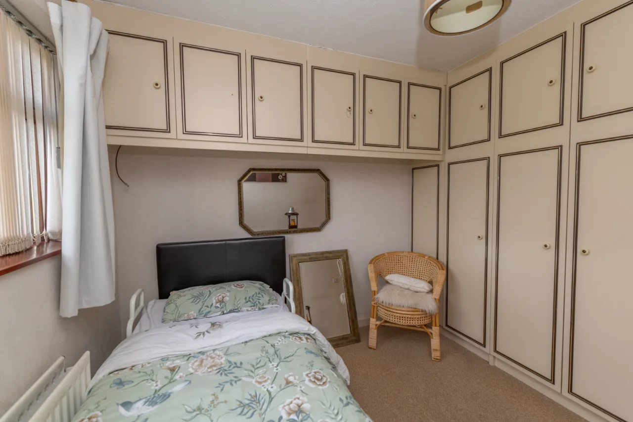 BEDROOM 3: 9'7" x 10'10" (2.93m x 3.31m) Carpet floor, double radiator, built in storage units, mahogany windows.