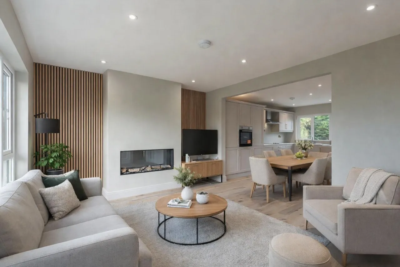 Outlook to front, recessed spotlighting, engineered wood effect flooring, electric fireplace, open to kitchen dining.