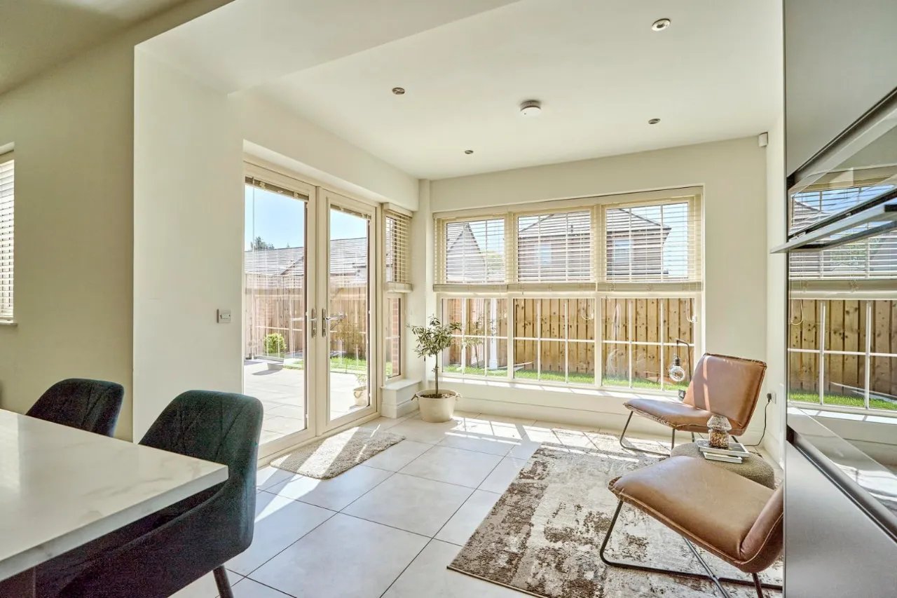 Range of high and low level units, laminate work surfaces, integral electric high level oven, inset sink unit with chrome mixer taps, concealed gas fired boiler, integral fridge freezer, integral ceramic hob, stainless steel extractor fan, ceramic tiled floor, island unit, built in breakfast bar, uPVC double glazed French doors to patio and garden, chrome spotlights.