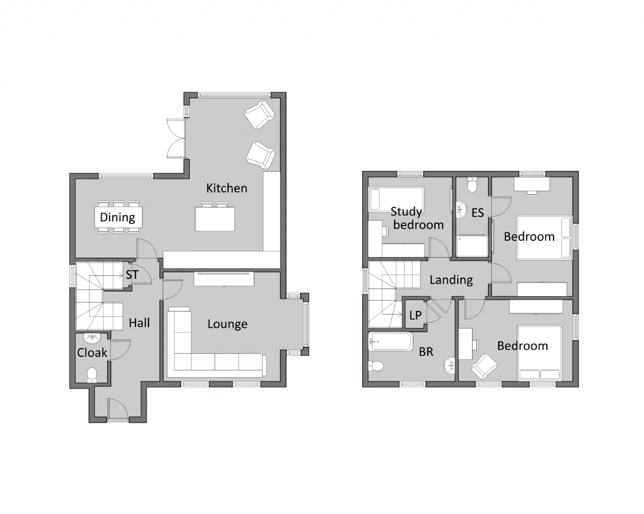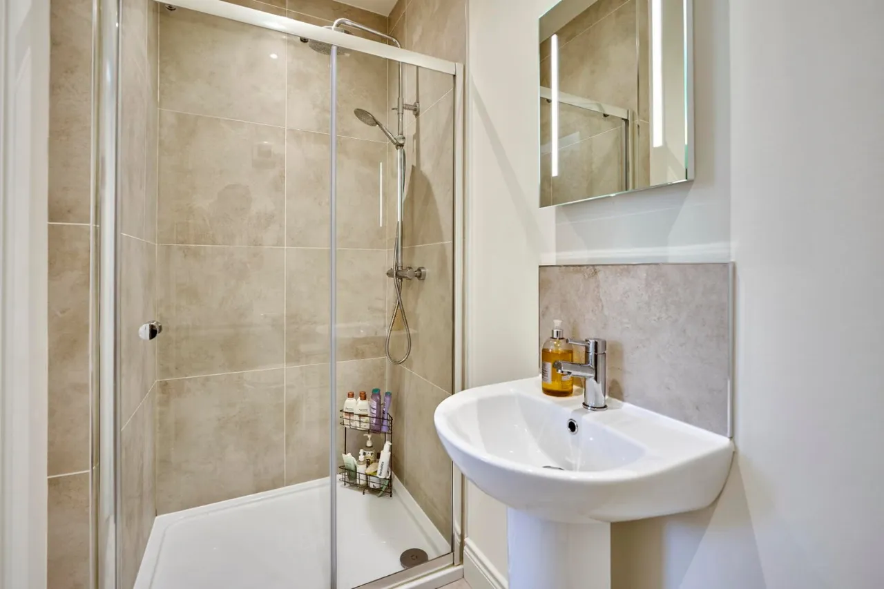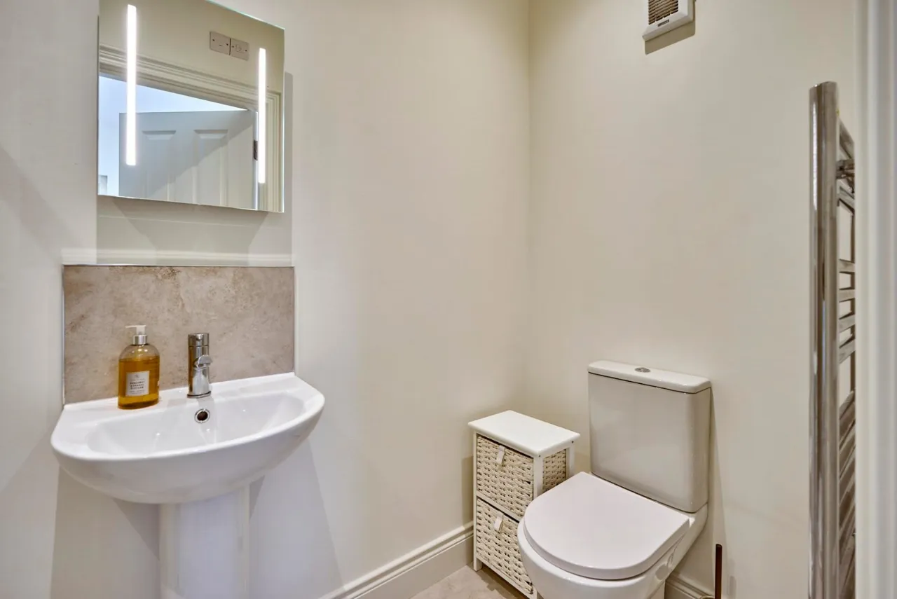 Contemporary white suite comprising:  Low flush WC, pedestal wash hand basin with chrome mixer taps and tiled splashback, fully tiled shower cubicle with chrome thermostatic shower unit, chrome heated towel radiator, ceramic tiled floor, extractor fan, low voltage spotlighting.