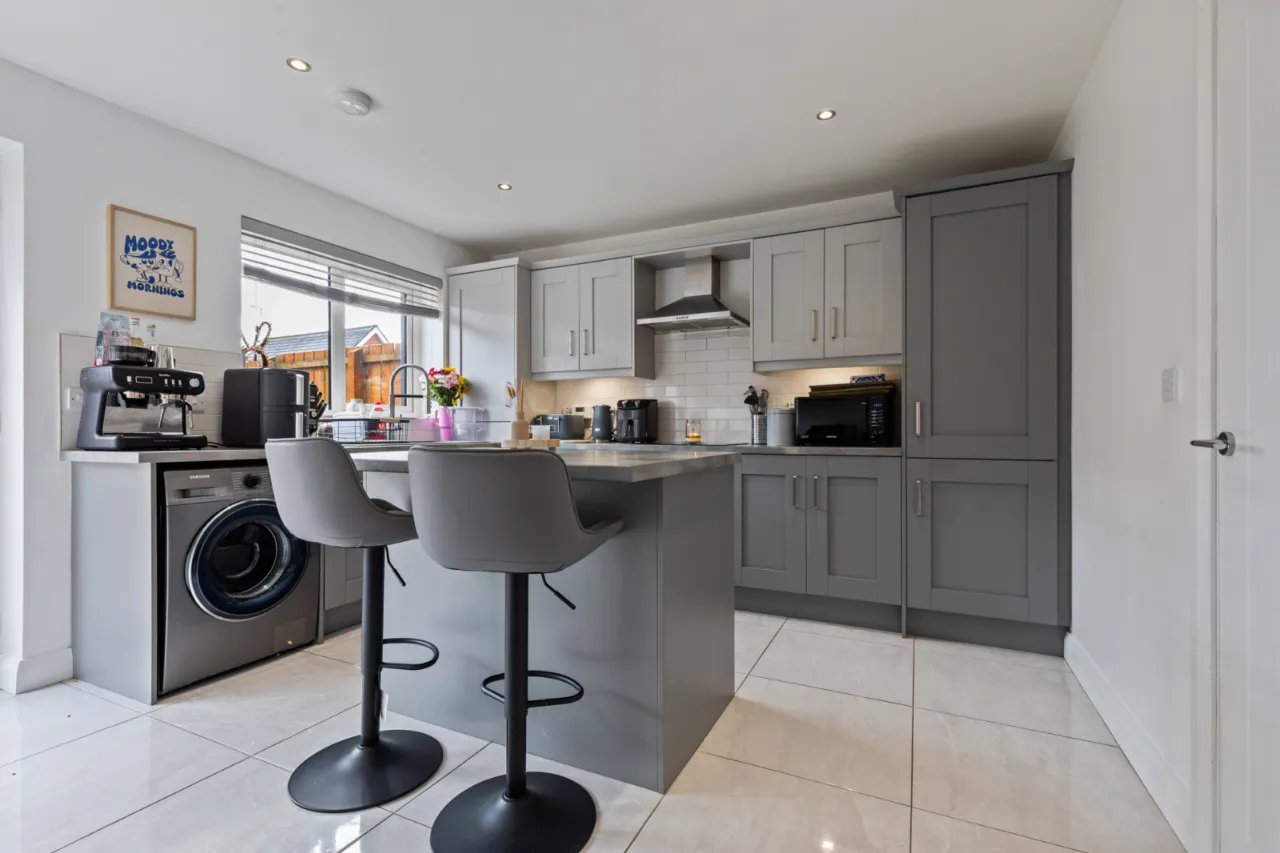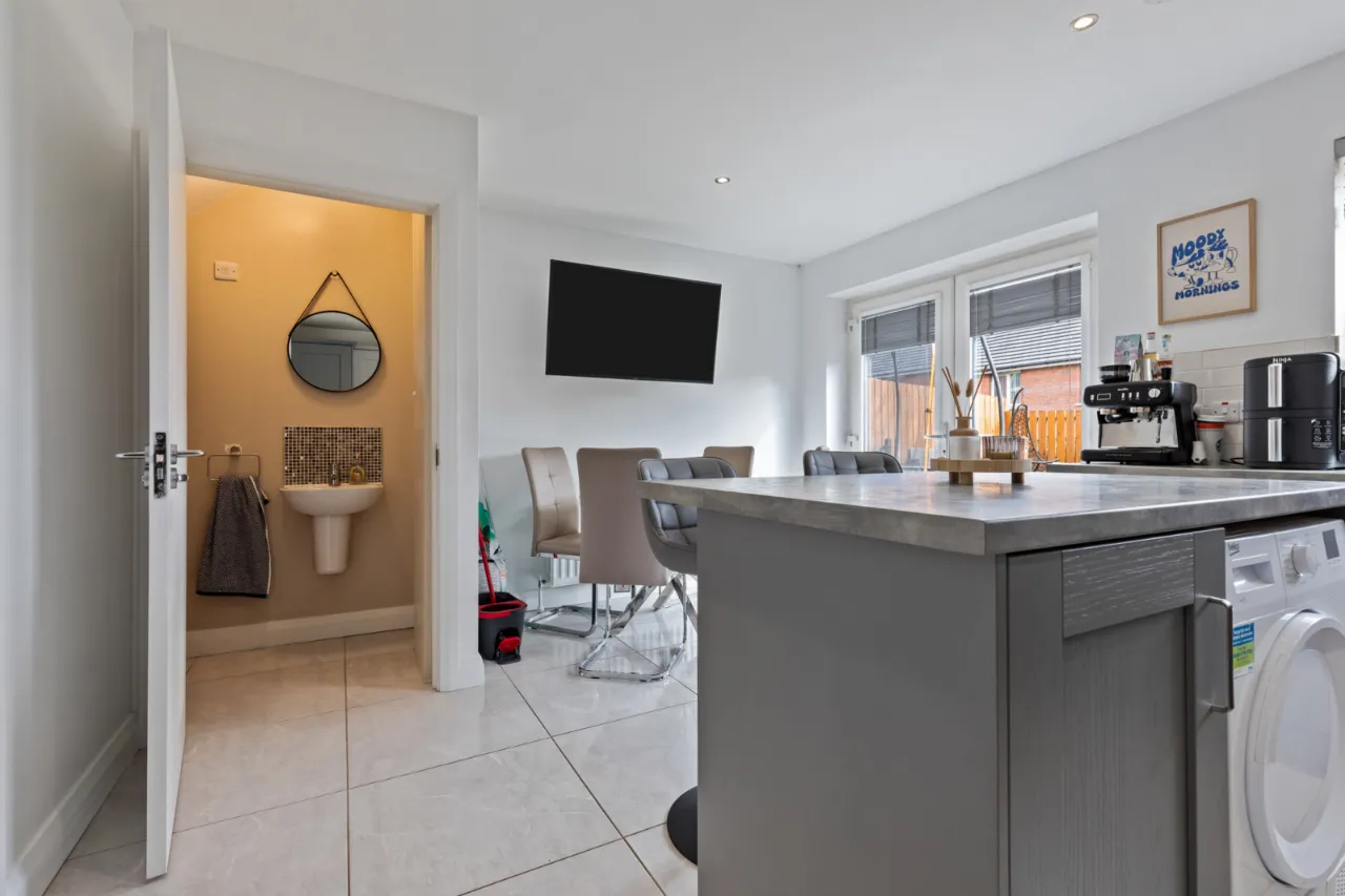 Excellent range of high and low level shaker style units, laminate wooden work surfaces, Island with breakfast bar, 1 1/4 bowl sink unit with chrome mixer taps, plumbed for washing machine, space for tumble dryer, concealed gas fired boiler, integrated electric under oven, 4 ring ceramic hob, integrated fridge freezer, space for dining, uPVC double glazed French door to garden, partly tiled walls, ceramic tiled floor.