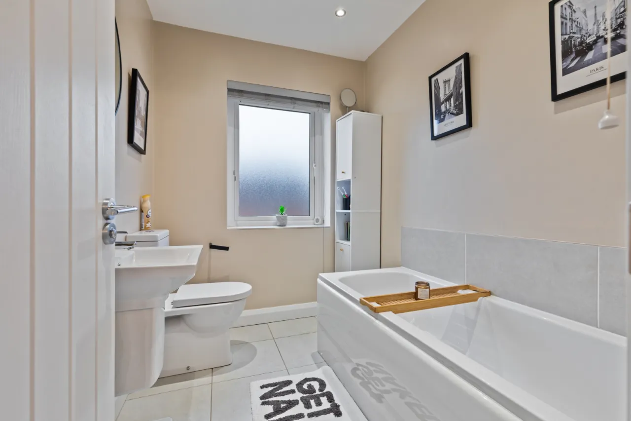 White suite comprising: Wash hand basin with chrome mixer taps and tiled splashback, low flush WC, panelled bath with chrome mixer taps and tiled splashback, chrome spotlights, ceramic tiled floor, extractor fan.