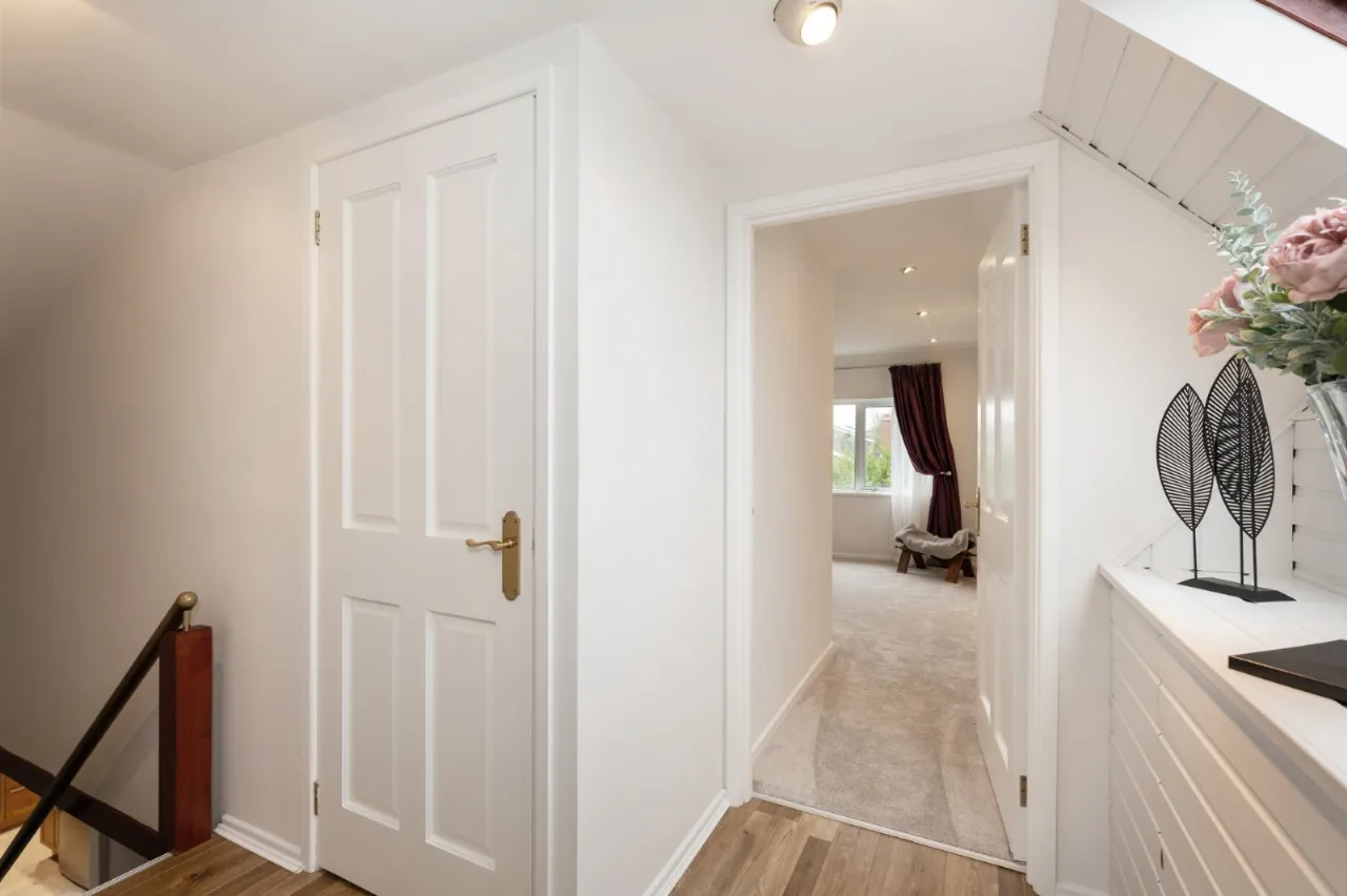 Laminate wooden floor, storage into eaves, velux window. Hotpress with lagged copper cylinder, built in storage.