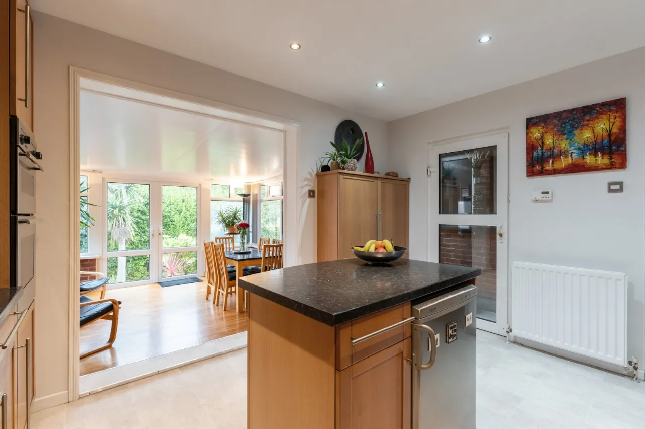 Range of high and low level shaker style units, island unit, 5 ring gas hob, integrated fridge, space for freezer. Open Plan to Conservatory.