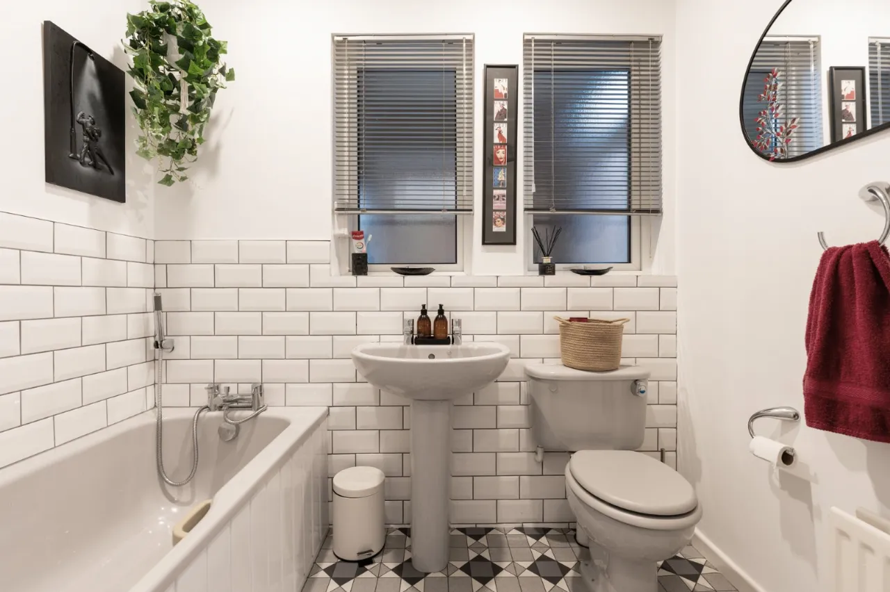 Coloured suite comprising: Low flush WC, pedestal wash hand basin, panelled bath with chrome mixer taps and telephone hand shower, chrome thermostatic shower unit, partly tiled walls.