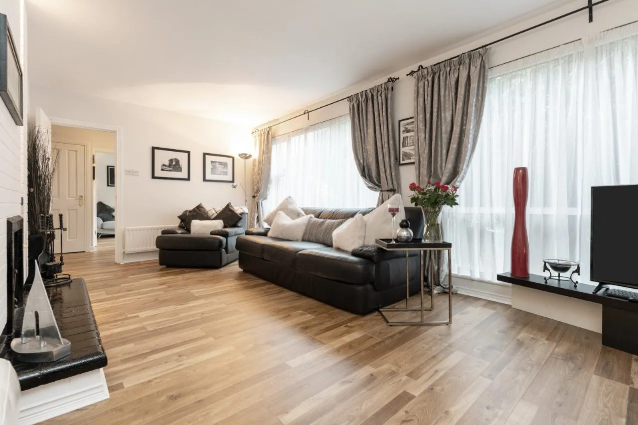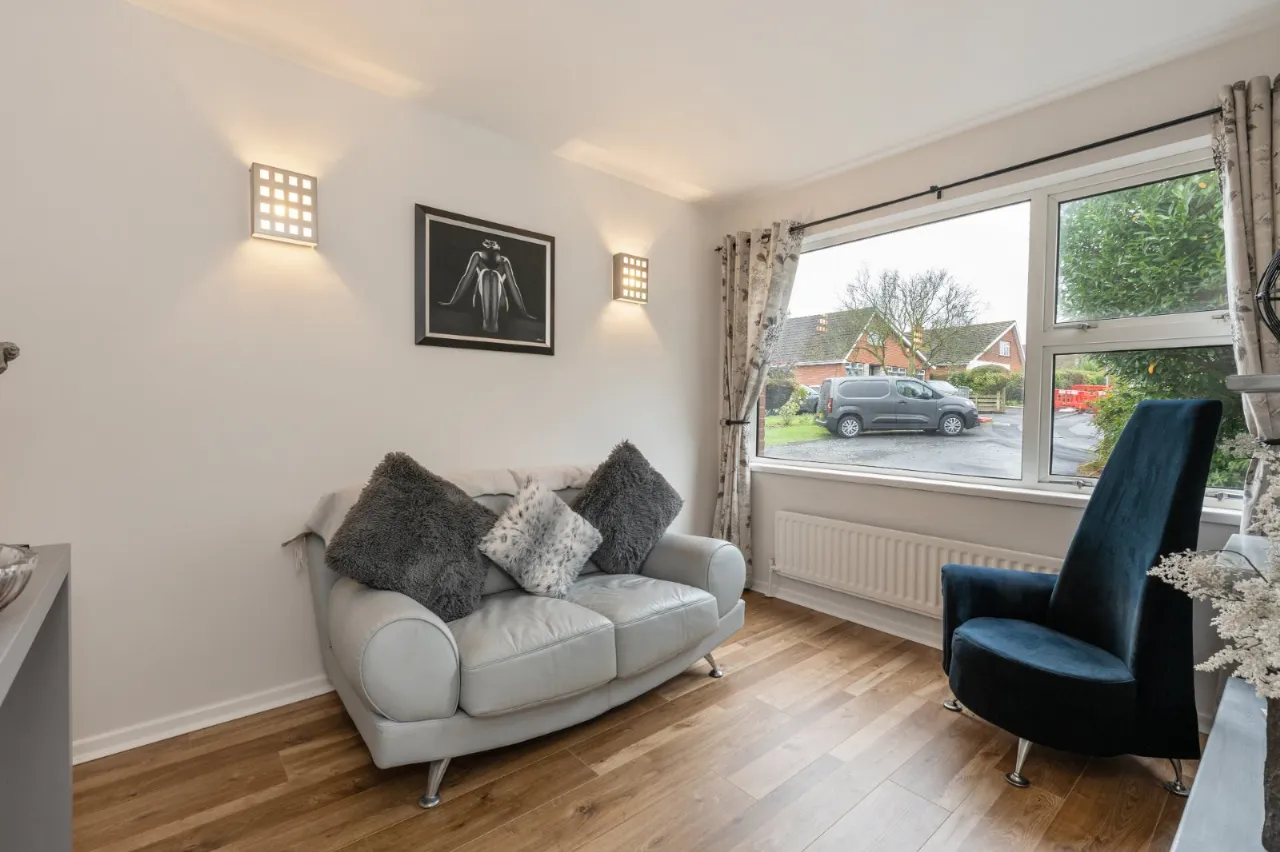 Solid wooden flooring. uPVC double glazed French doors to garden.