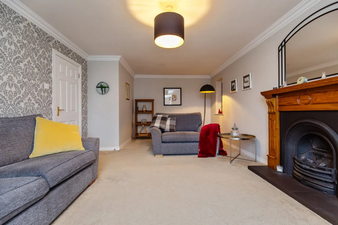 Hardwood fireplace surround, cast iron and gas coal effect fire, corniced ceiling, space for casual dining.